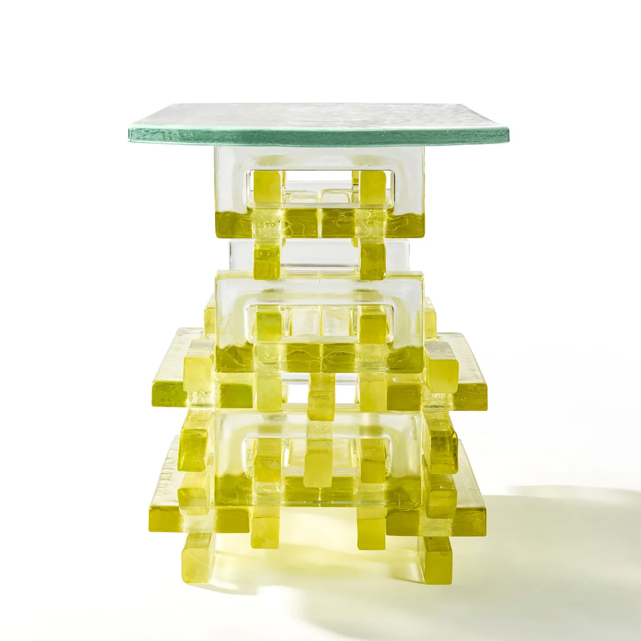 Il tavolino Chain presenta una struttura unica composta da elementi in vetro colato intrecciati tra loro, ispirata alla falegnameria tradizionale asiatica e all’architettura dei templi. Il design prevede l’utilizzo di diversi mattoni a forma di ciambella, tagliati e infilati l’uno nell’altro, creando una base scultorea e ricca di dettagli in ambra chiara, sormontata da una superficie in vetro cristallo testurizzato. Questa edizione numerata mette in risalto la raffinatezza artigianale e l’interazione tra forma e trasparenza.