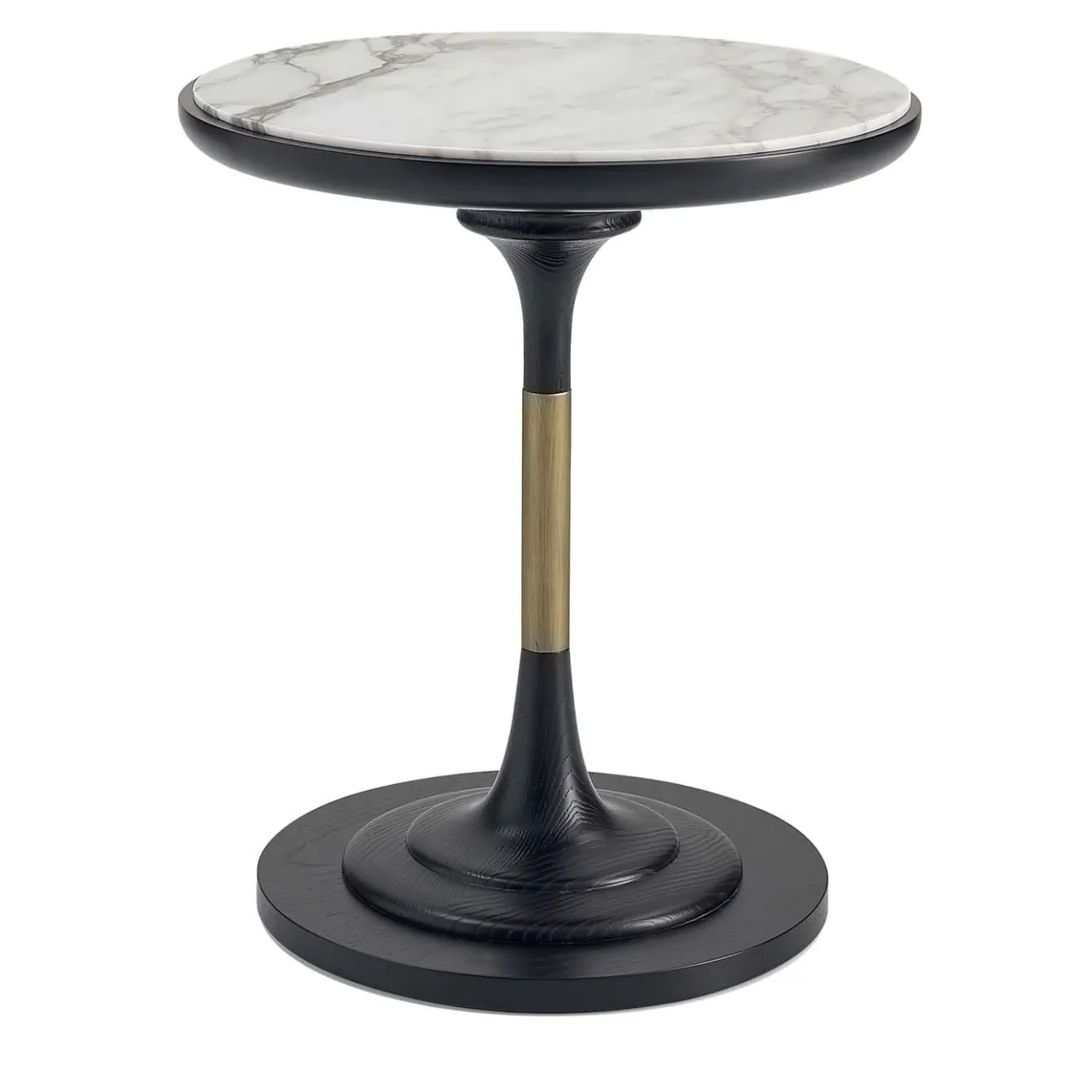 Questo tavolino vanta una squisita combinazione di materiali raffinati. Eclettico e versatile, la sua struttura è realizzata in compensato e MDF rivestito di frassino ed è elegantemente arricchita da parti in frassino massiccio laccato nero e dettagli in ottone brunito. L’elemento di spicco di questo pezzo è lo splendido piano rotondo in marmo Calacatta oro.