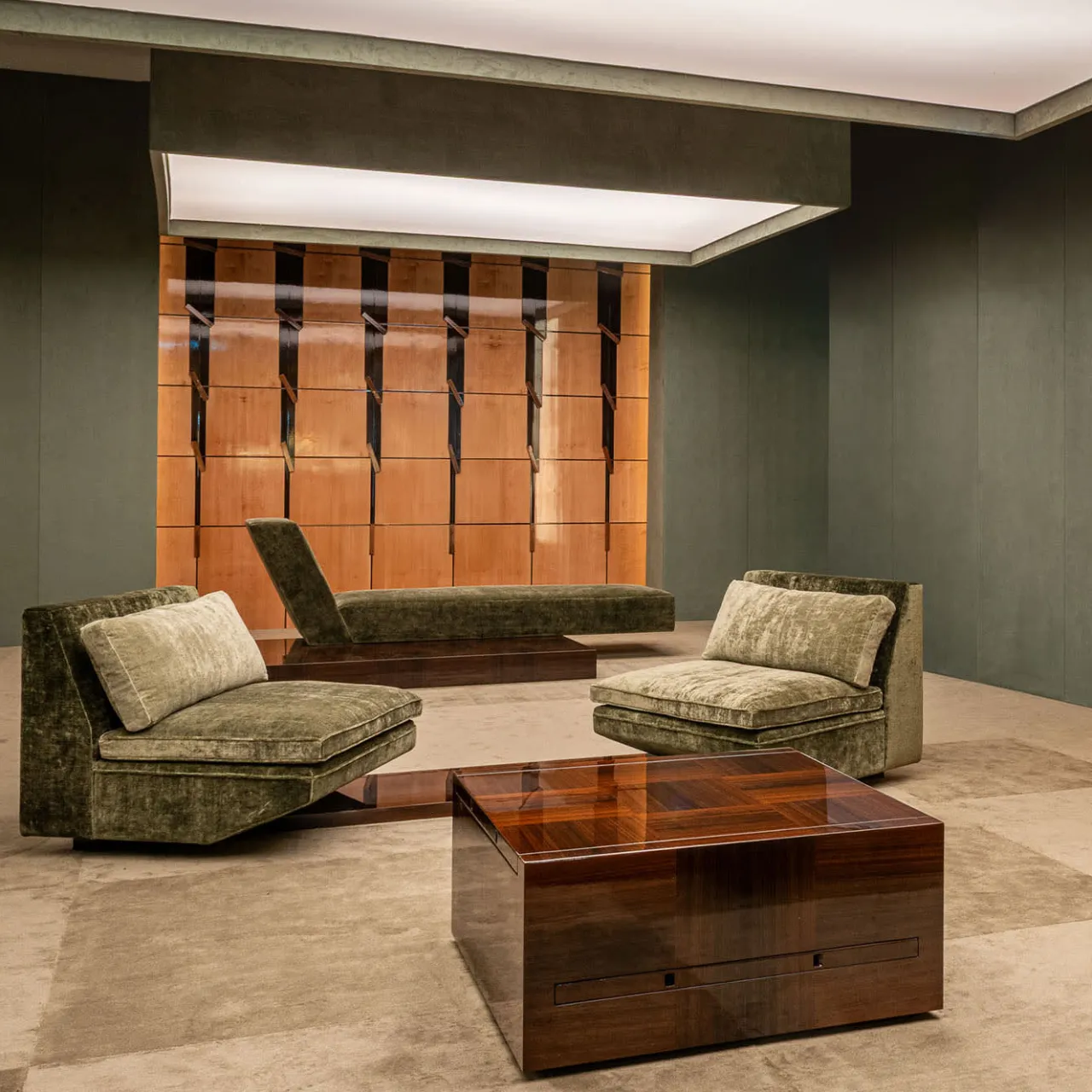Il tavolino Arcano di Storagemilano è caratterizzato da un cubo esterno compatto in legno impiallacciato in eucalipto lucido con ripiani estraibili e scomparti nascosti. I ripiani interni in noce italiano, noce canaletto e acero offrono raffinate possibilità di contenimento. La base in vetro specchiato color ottone esalta il contrasto visivo tra l’estetica elegante e il design multifunzionale del tavolo.