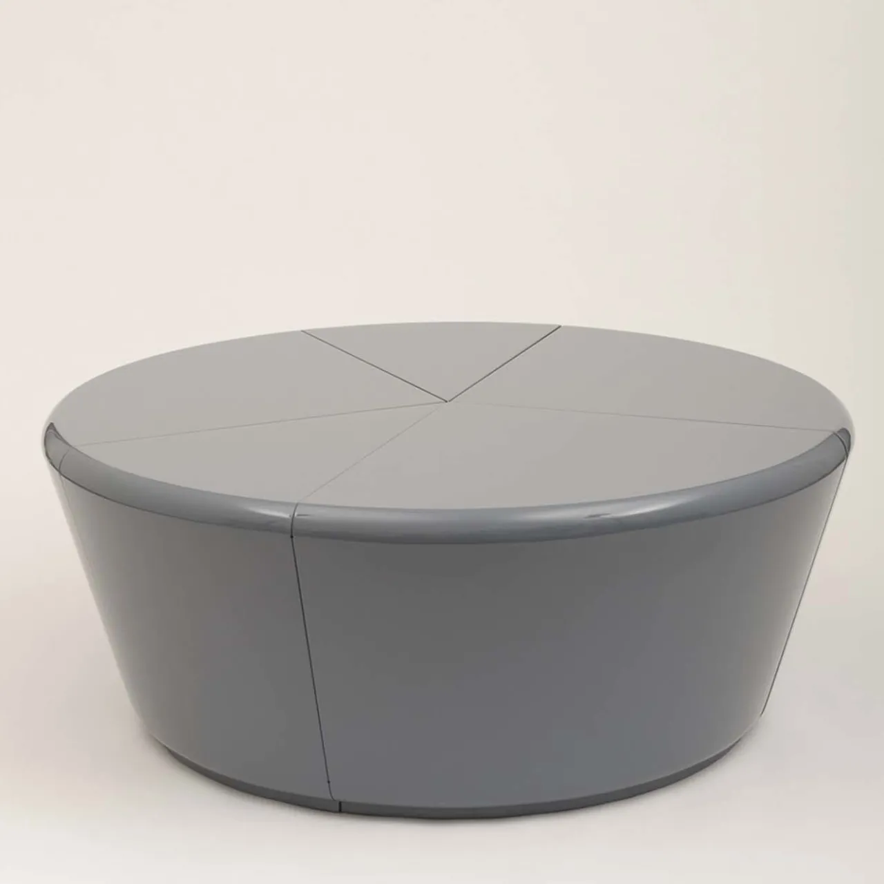 Questo originale tavolino da caffè, disegnato da Davide Rizzo in collaborazione con AVD, è un pezzo versatile e glamour di arredamento funzionale, il cui design minimale e moderno si adatta a un interno contemporaneo. Una volta assemblata, la struttura in legno crea una forma rotonda a tamburo con lati affusolati. Interamente rivestito in poliestere grigio con finitura laccata lucida, questo tavolo è dotato di cunei staccabili con un rivestimento interno in rame spazzolato che offre un contrasto cromatico e testuale di grande effetto visivo. I pezzi possono essere sistemati singolarmente a sostegno di un divano o distribuiti nella stanza per creare uno stile coeso.