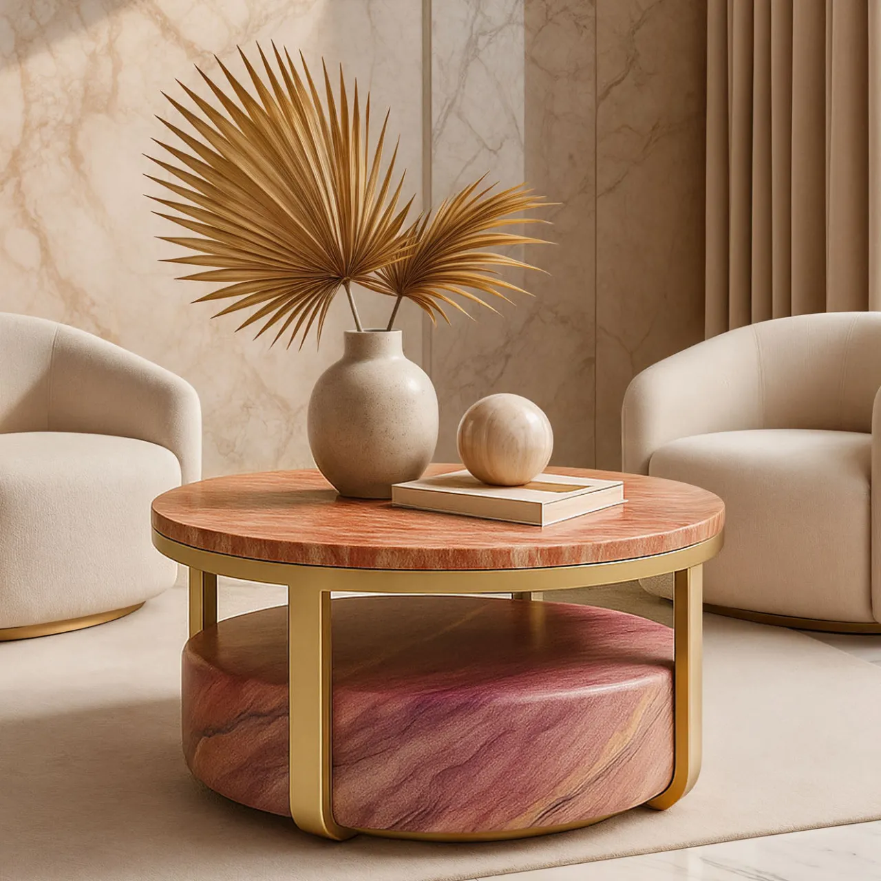 Il tavolino da caffè Makaron presenta un’armonica combinazione di toni vibranti di quarzite ispirati dalla natura e dalla femminilità. Caratterizzato da linee morbide e arrotondate, questo pezzo combina una sorprendente base in quarzite viola chiaro con un piano coordinato, sorretto da un telaio minimalista dorato che ne esalta l’appeal elegante e contemporaneo. Parte della collezione Somnium.