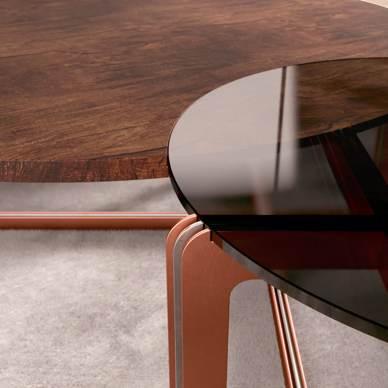 Il tavolino da caffè rotondo Eclisse presenta una base composta da tre piastre in acciaio tagliate al laser perfettamente incastrate, consentendo varie combinazioni di colori. Il piano è un’elegante fusione di vetro fumé e noce canaletto, creando un design unico e sofisticato. Finiture e materiali personalizzati sono disponibili su richiesta, aumentando la sua versatilità negli interni contemporanei. Progettato da Puravisione. Si prega di contattare il concierge per ulteriori informazioni.