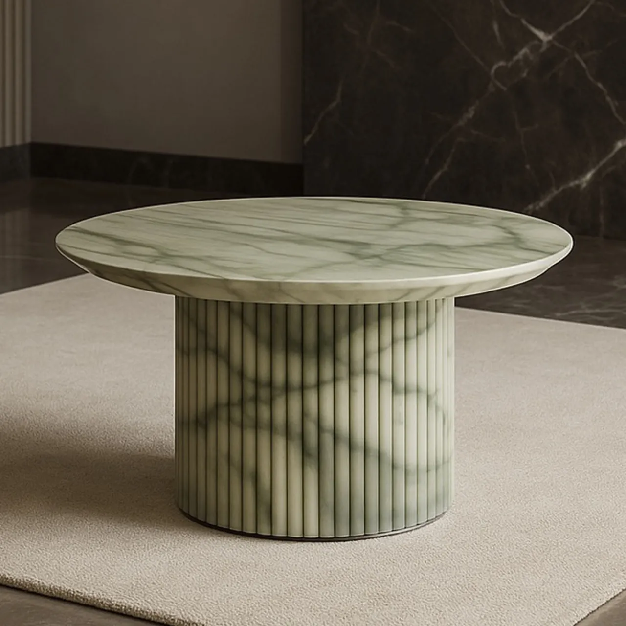 Un raffinato tavolino da caffè con un piano circolare e una base cilindrica con scanalature verticali. Il design mette in mostra un’armoniosa fusione di linee organiche e toni ricchi ispirati dalla natura e dalla femminilità, evocando un’estetica elegante e contemporanea. Parte della collezione Somnium, evidenzia palette di colori vividi e distintivi attraverso forme morbide e fluide.
