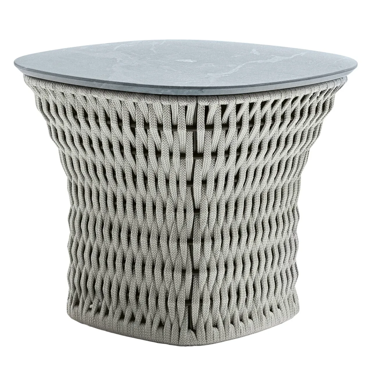 Tavolino da esterno in una combinazione di metallo nero satinato trattato in cataforesi e cordame intrecciato grigio chiaro. Piano in pietra naturale trattata “CARDOSO” con logo Giorgio Collection inserito. Speciale copertura per esterni inclusa nel prezzo.