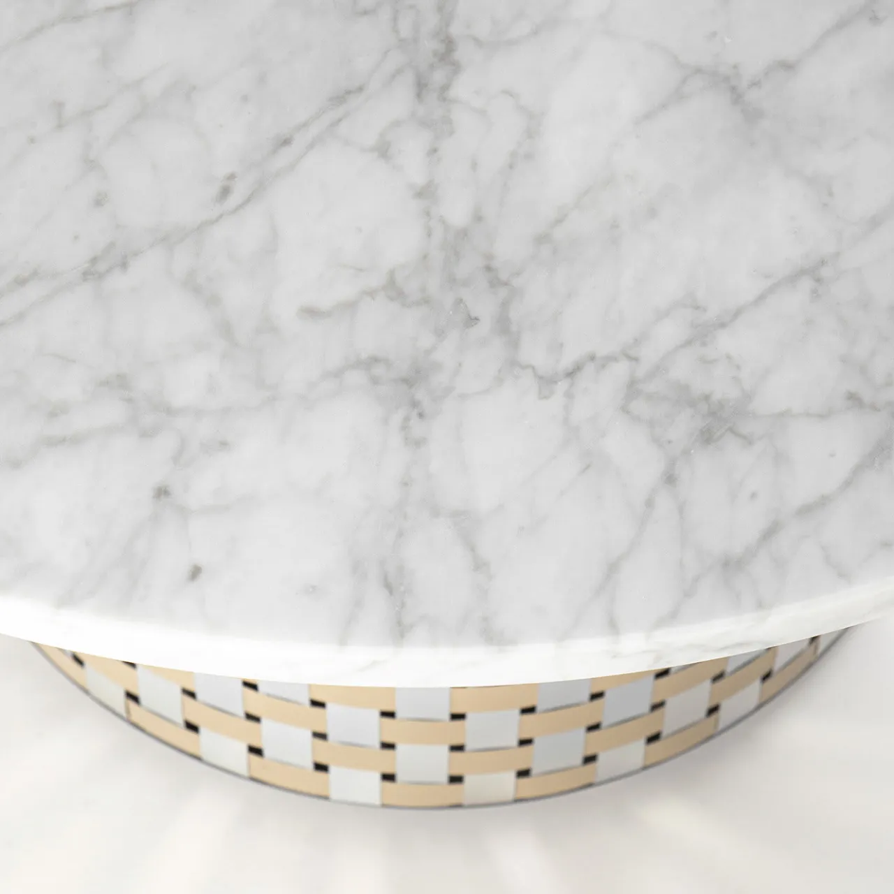Questo tavolino da caffè, audace e maestoso, è un complemento raffinato per qualsiasi soggiorno o area contract moderna o contemporanea. Ispirato ai motivi del movimento Optical Art degli anni Sessanta, poggia su un’ampia base rotonda costituita da un suggestivo intreccio di lamelle di alluminio naturale e dorato, noto come Splot. Le ruote nascoste permettono di spostare facilmente il tavolino. Prende il nome da Hemera, la dea greca della luce del giorno, ed è completato da uno splendido piano rotondo in marmo bianco di Carrara.