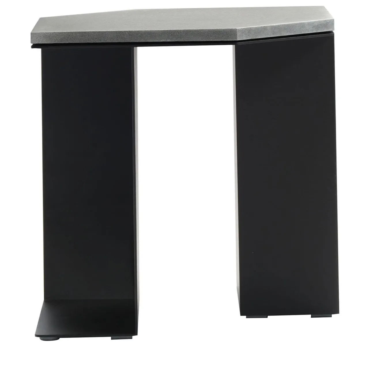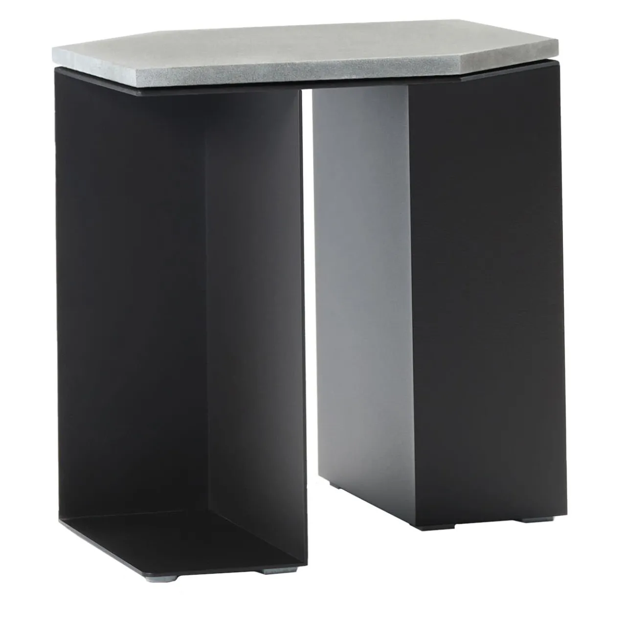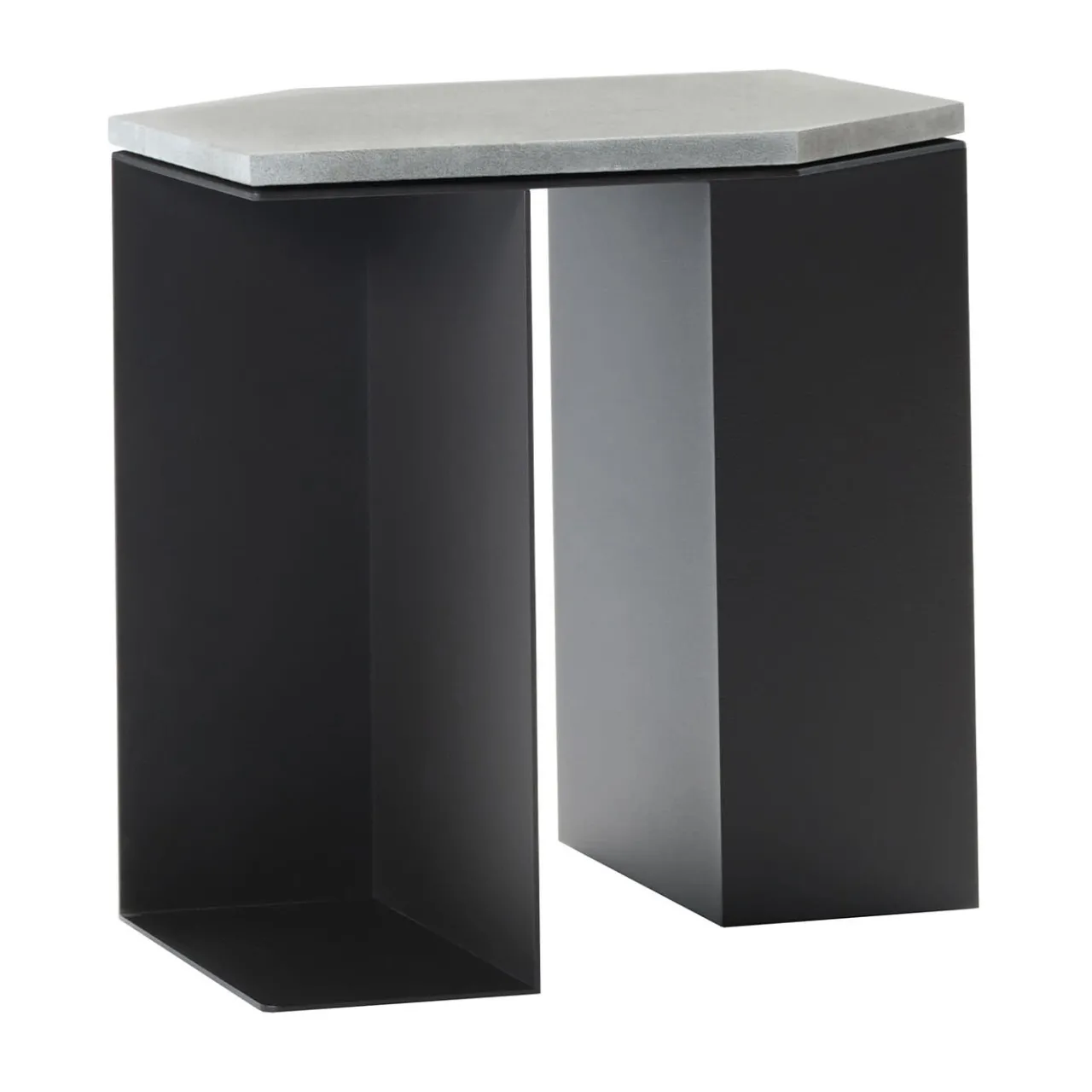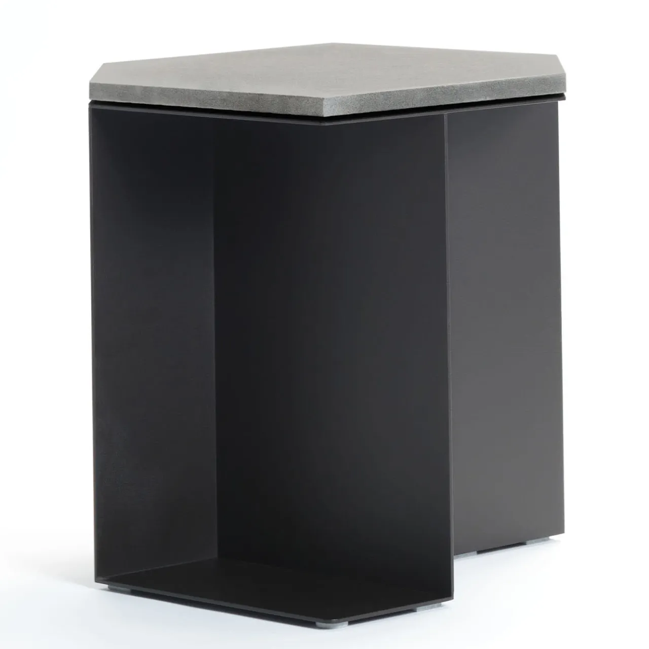 Un design in stile geometrico dove l’inaspettata funzionalità incontra linee rigorosamente scolpite, questo tavolino si distingue per un’interazione tra pieni e vuoti che crea pratici spazi di contenimento delineati da profili strutturali minimalisti. Assemblate e saldate a mano, le lastre di metallo goffrato nero opaco (RAL 9017) sostengono un piano esagonale allungato in pietra grigia lucida.