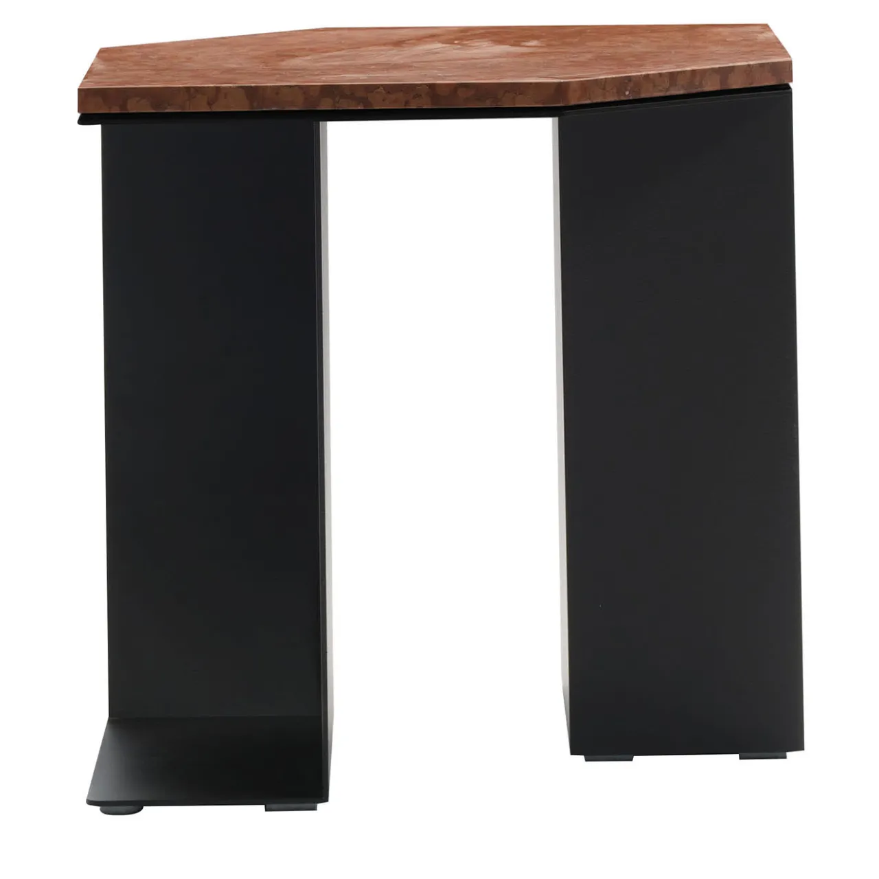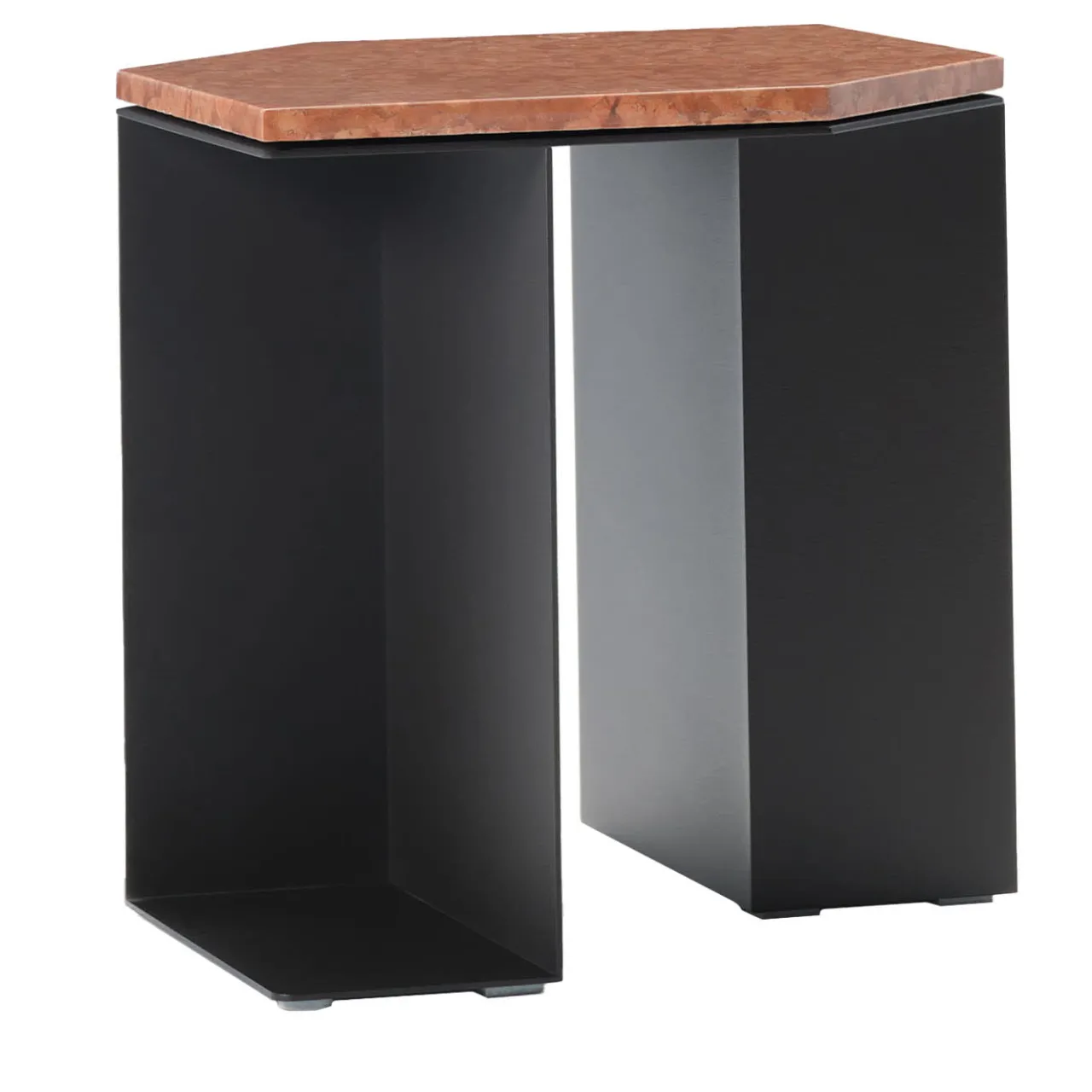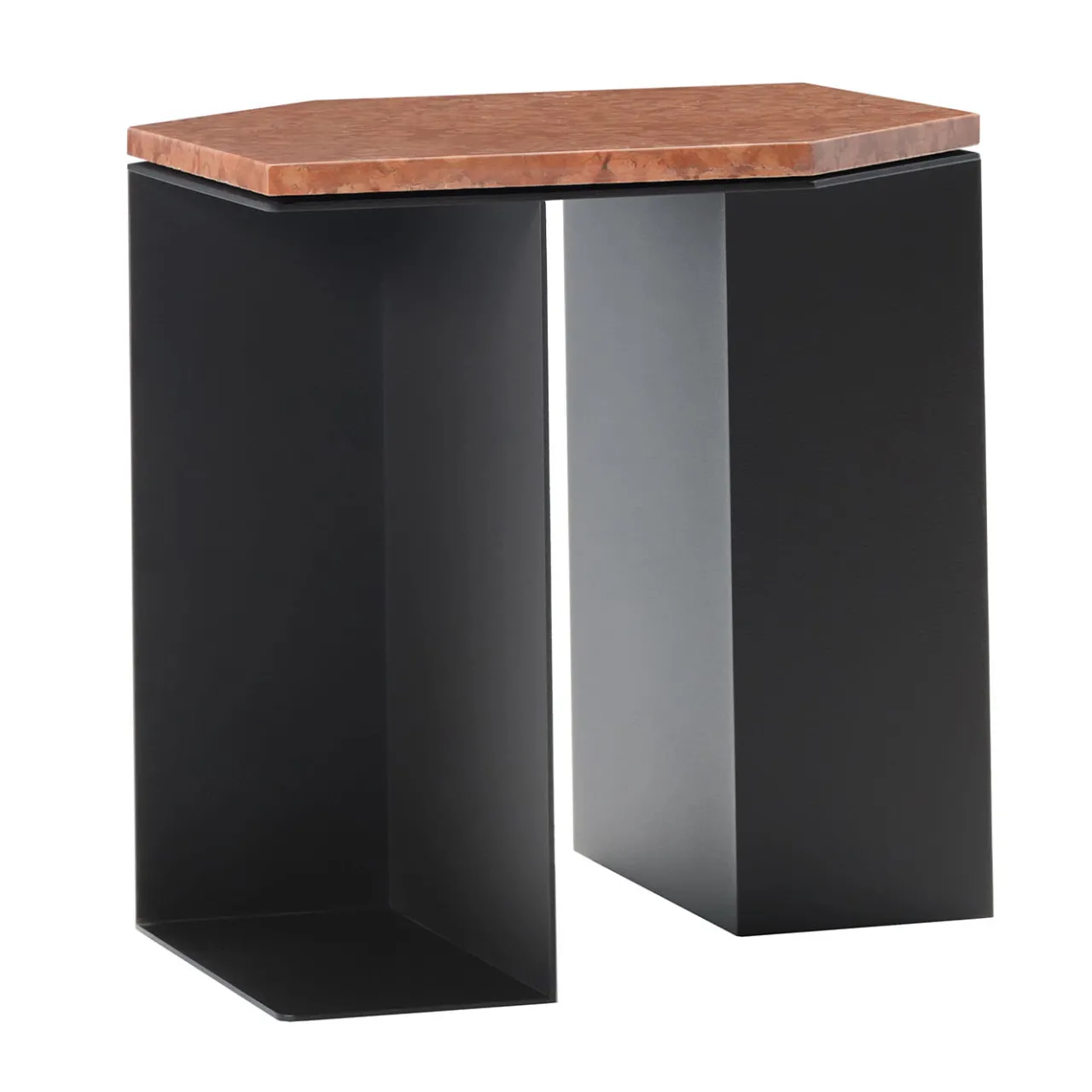 Questo esclusivo tavolino da caffè presenta linee pulite che esaltano le severe linee rette della silhouette squadrata, rivelando un’intrigante interazione tra pieni e vuoti che fungono da pratici spazi di contenimento. Realizzato assemblando e saldando a mano lastre di metallo con finitura nera opaca goffrata (RAL 9017), la struttura si estende fino al piano esagonale allungato in pregiato marmo Rosso Verona.