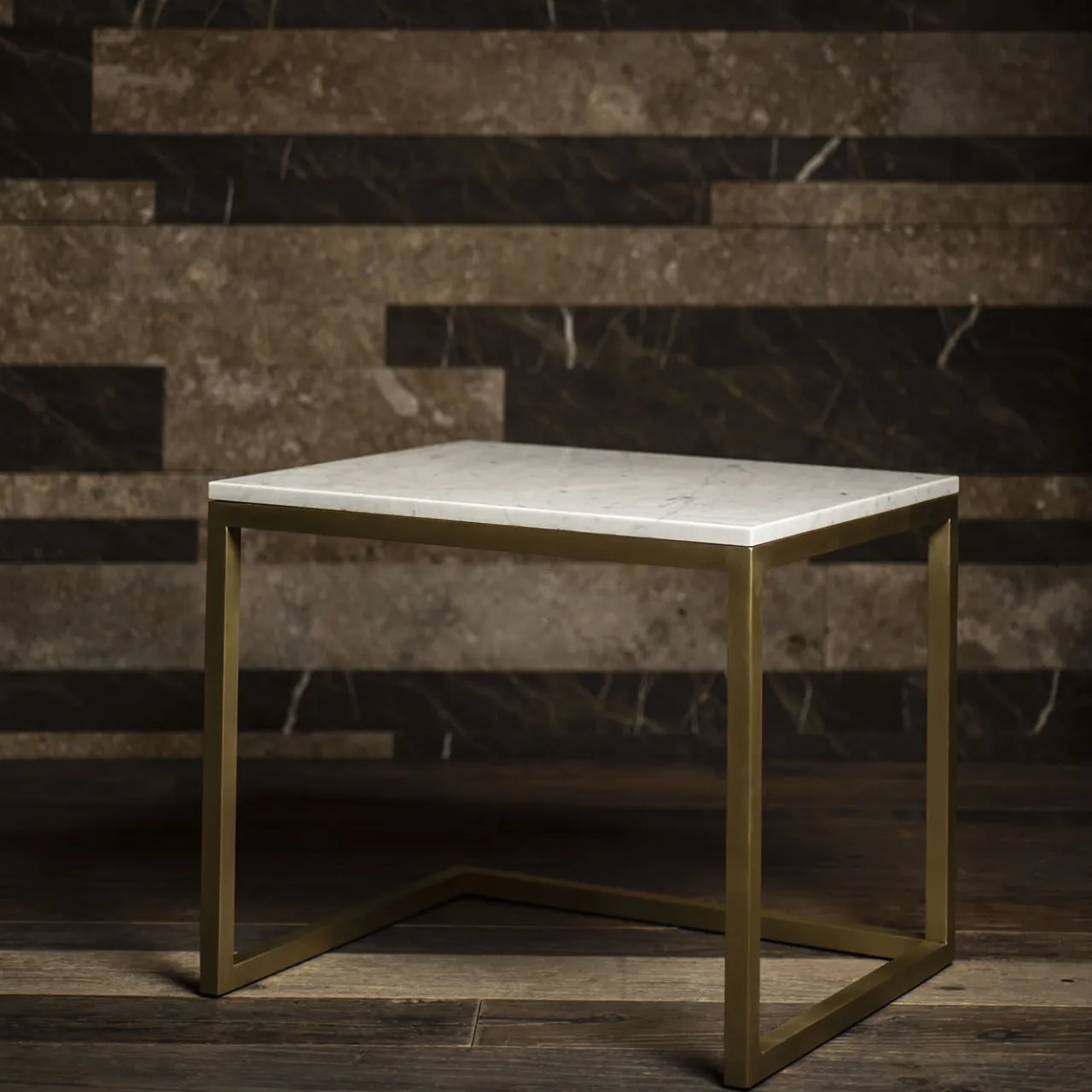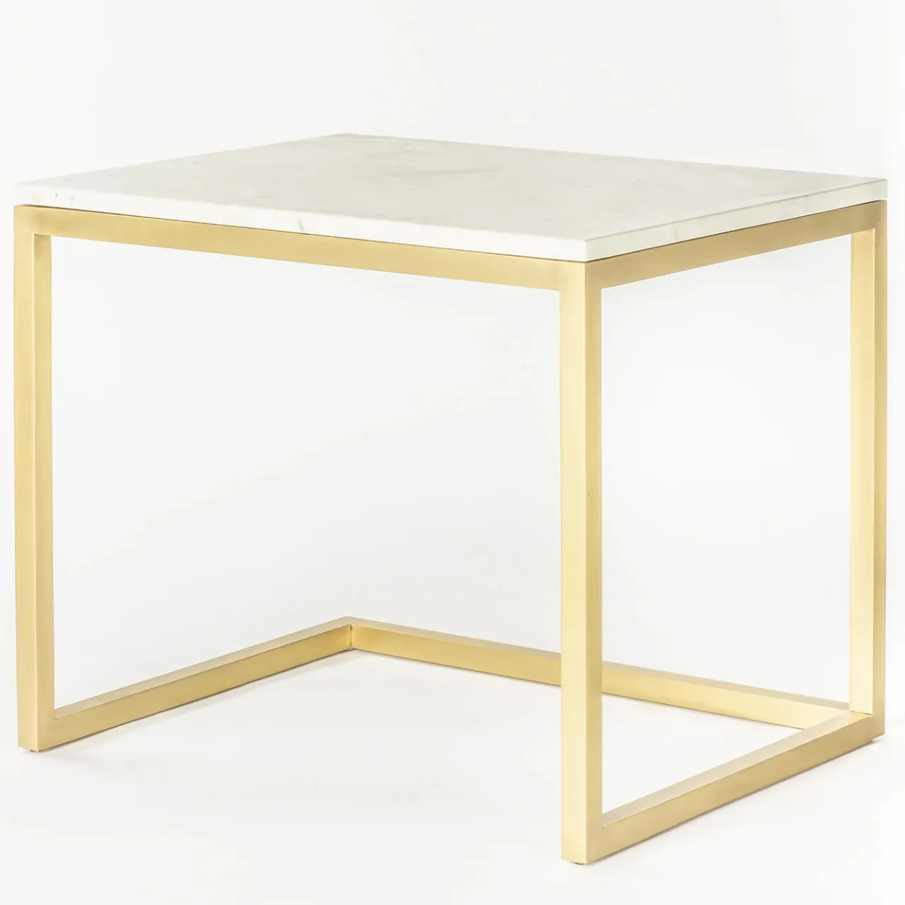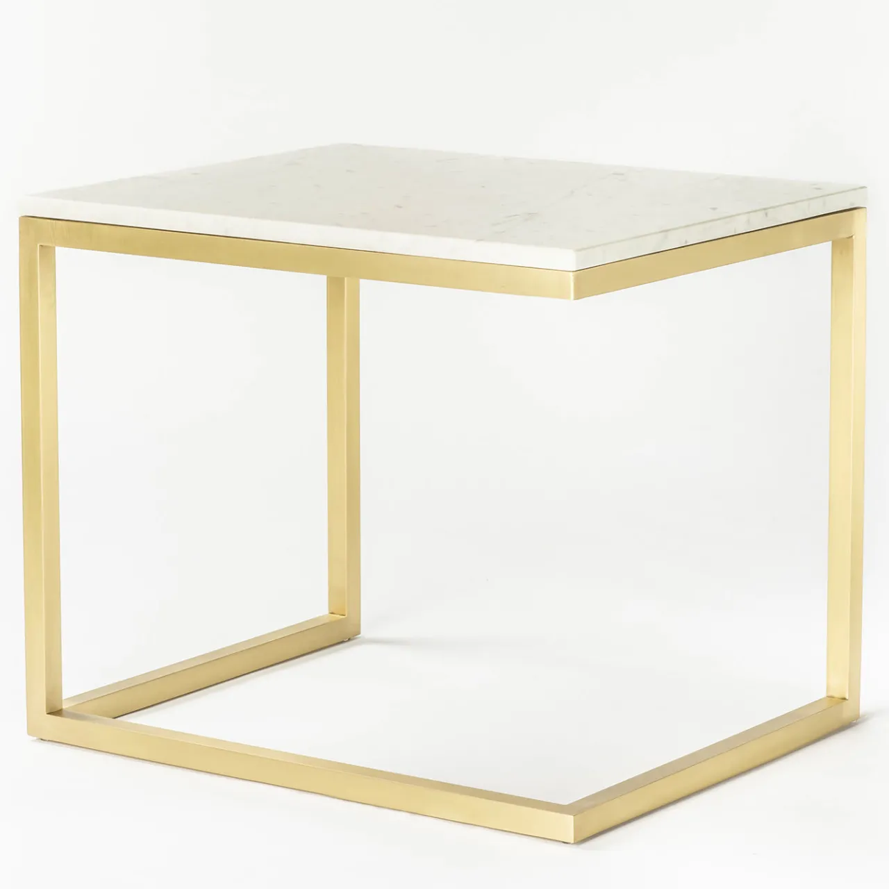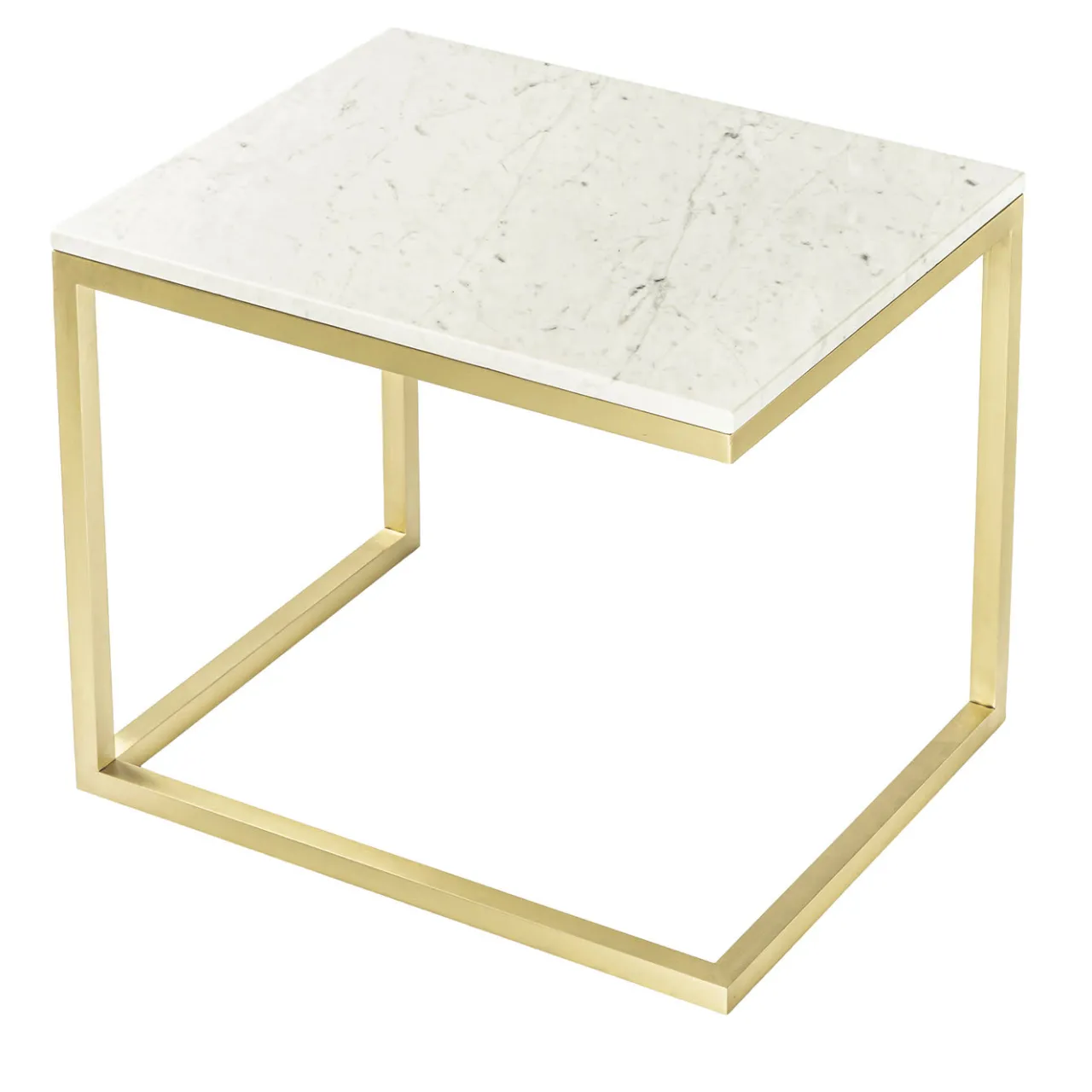 Questo tavolino fa parte di una splendida serie di tavolini e tavolette di Antonio Saporito, che combina due materiali tradizionali in una forma contemporanea. Combinando due materiali tradizionali in una forma contemporanea, presenta una base in ottone composta da tre gambe che poggiano su una base comune e un piano in marmo bianco di Carrara.