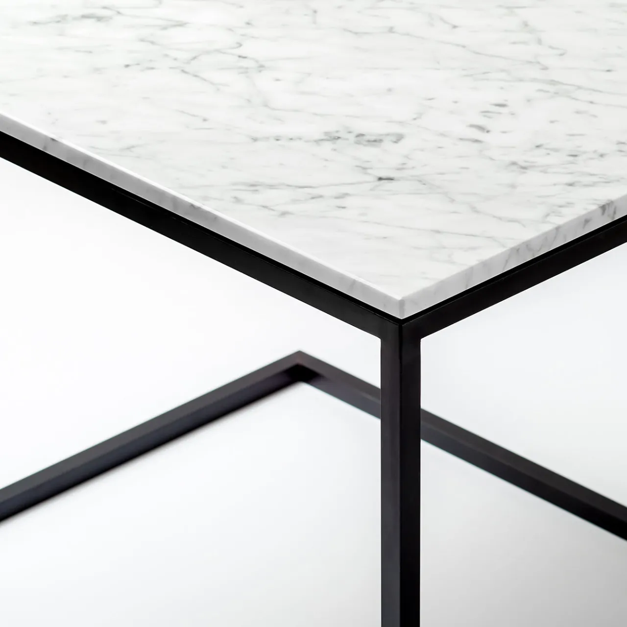 L’intramontabile combinazione di bianco e nero è interpretata in modo unico in questo prezioso ed elegante progetto di Antonio Saporito. Testimonianza di un’estetica minimalista e di una maestria artigianale, presenta una base in ferro laccato nero di grande impatto visivo, composta da tre gambe in equilibrio su una base comune, e un elegante piano in marmo bianco di Carrara.