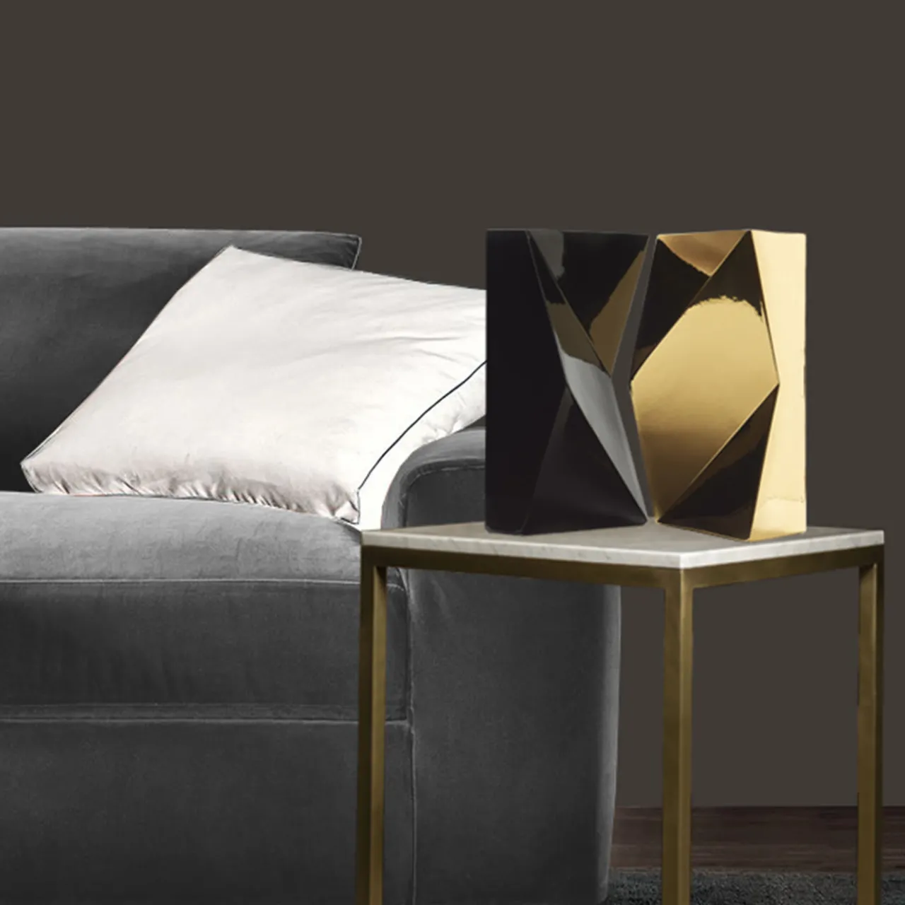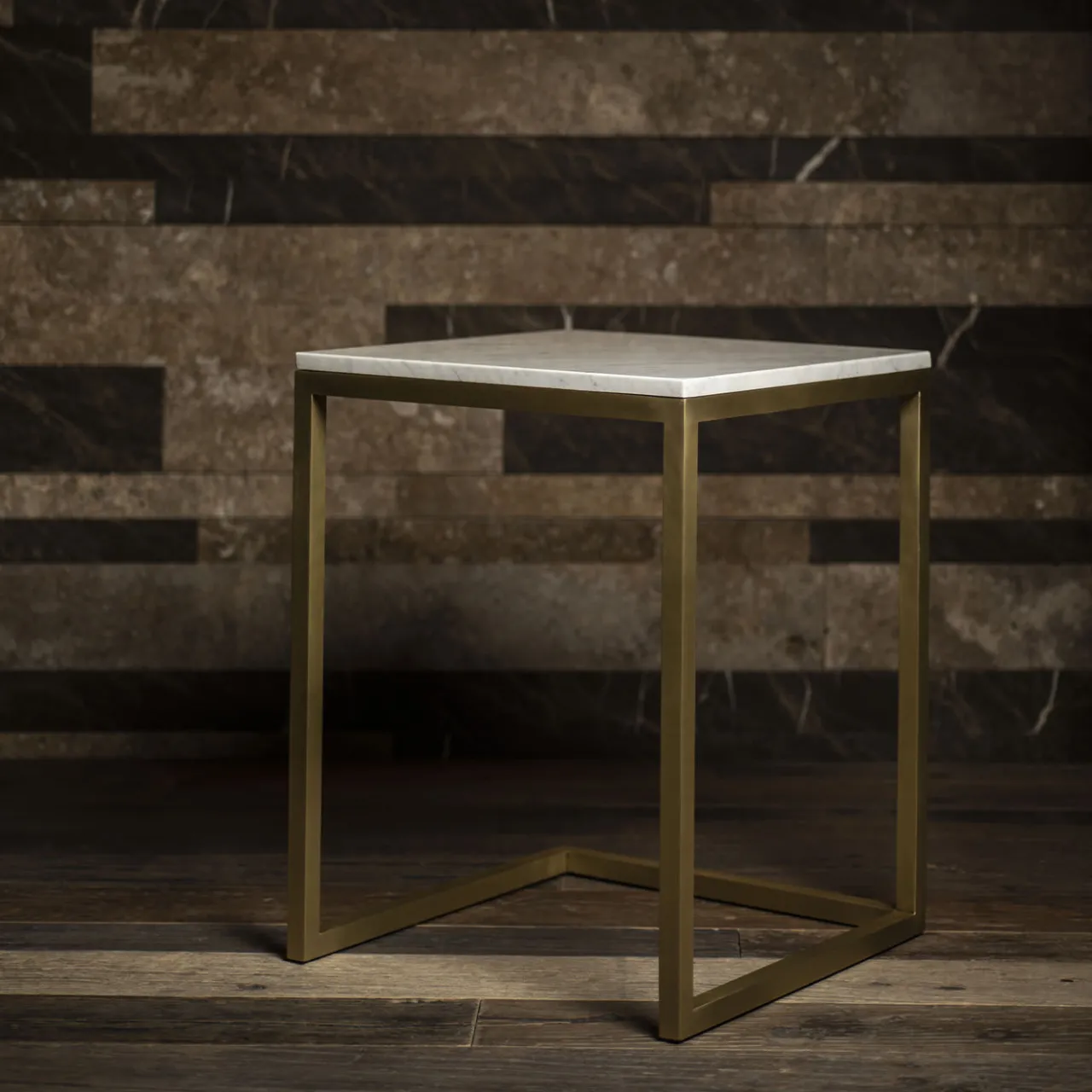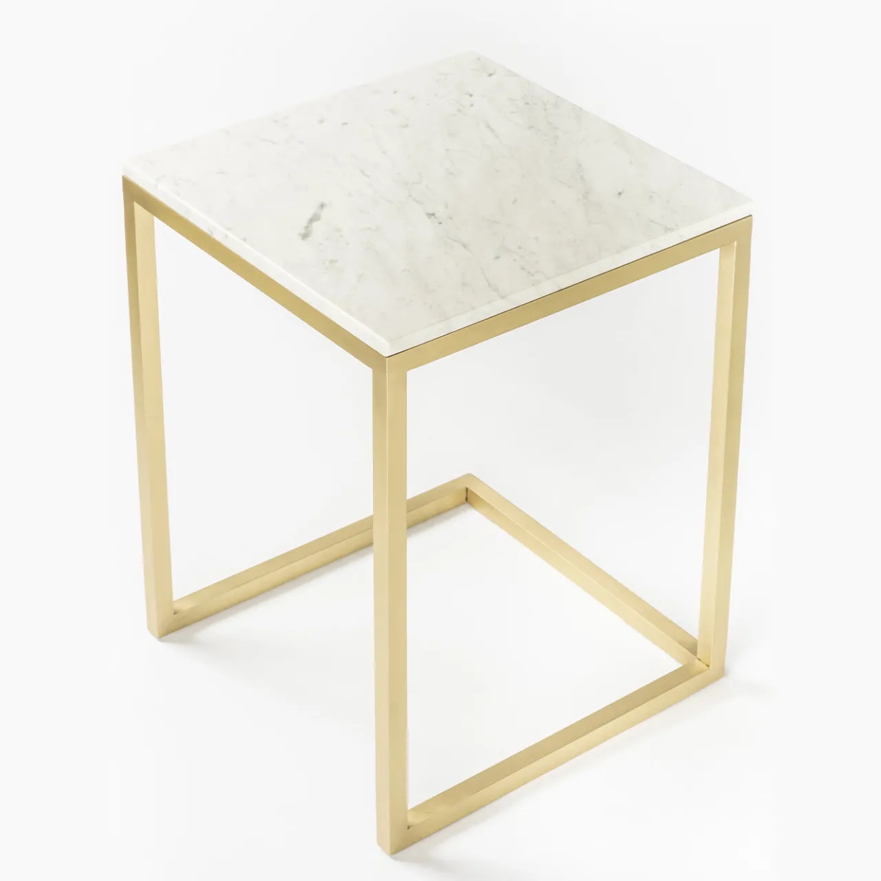 Un gioco visivamente equilibrato di tonalità e linee geometriche, questo tavolino è un design raffinato e opulento di Antonio Saporito. Ideale per completare un arredamento contemporaneo ma adatto anche a un interno classico grazie alla combinazione di ottone e marmo, presenta una struttura di grande effetto composta da tre gambe collegate da una base robusta e un elegante piano in marmo bianco di Carrara con venature naturali.