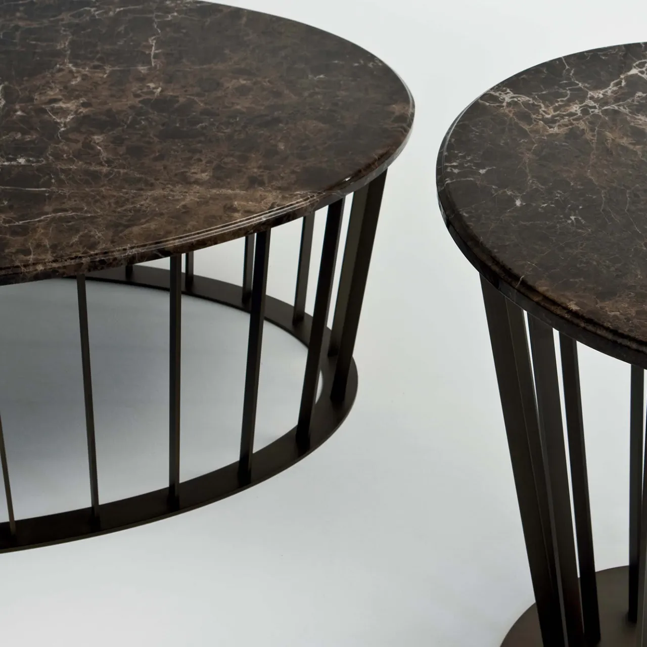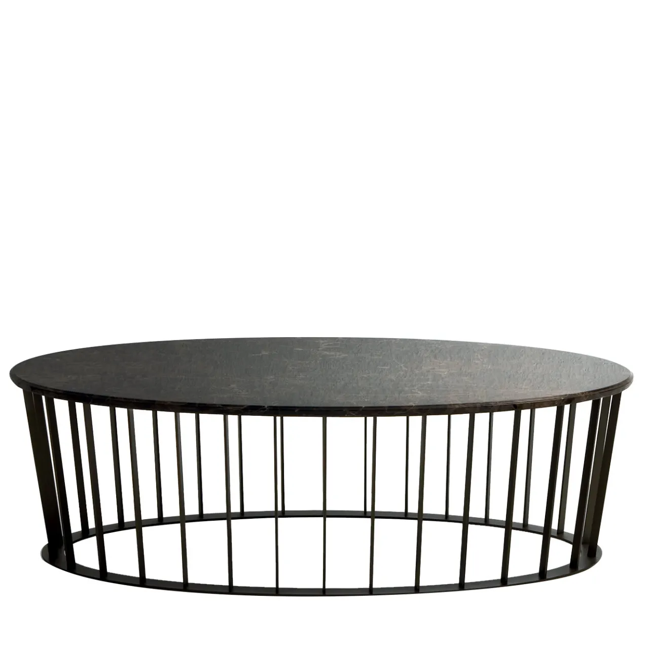 Durevole, versatile e accattivante, questo tavolino ovale definisce lo spazio del soggiorno con la sua ampia presenza fisica e il suo design di ispirazione industriale. La struttura portante è costituita da doghe metalliche rifinite in un colore bronzo scuro opaco, disposte sulla base ad anello in un design simile a un recinto. Il piano ovale è realizzato in marmo nero impreziosito da venature dorate, una combinazione moderna ed elegante, versatile e senza tempo. Disponibile anche con piano in legno di eucalipto e base cromata. Chiedete al Concierge i dettagli e il prezzo di queste opzioni.