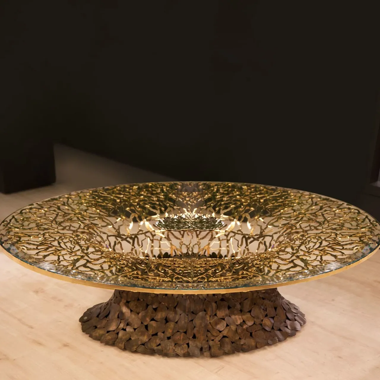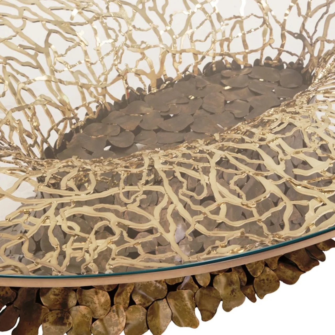 Celebrazione della bellezza della natura, questo tavolino basso presenta una base in corten marrone con rami color oro chiaro, che sostiene un piano in vetro. Il vetro trasparente rivela i delicati rami dorati sottostanti, trasformando il tavolo in una vetrina di naturale eleganza. Disponibile anche in altre finiture, per maggiori informazioni contattare il concierge.