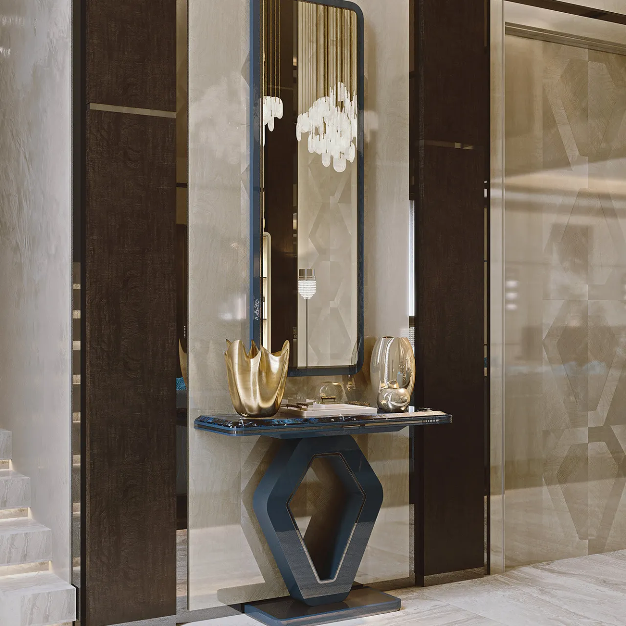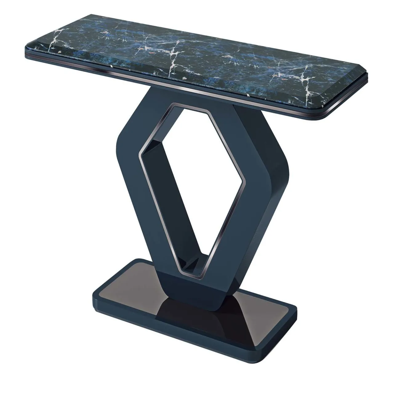 Il tavolino Hanami Urban Chic vanta una struttura in legno massiccio con finitura laccata lucida in poliestere blu. La sua silhouette geometrica crea un punto focale immediato in qualsiasi spazio abitativo, abbinata al piano in marmo smussato Azul Nahia per un contrasto elegante. Impreziosito da dettagli cromati con una sofisticata finitura nera.