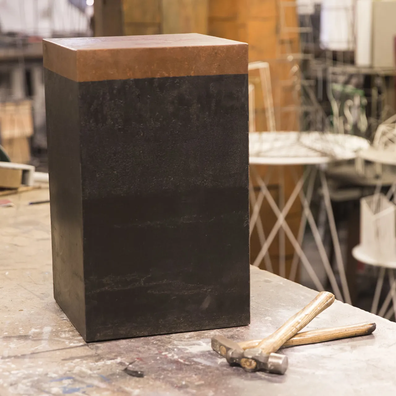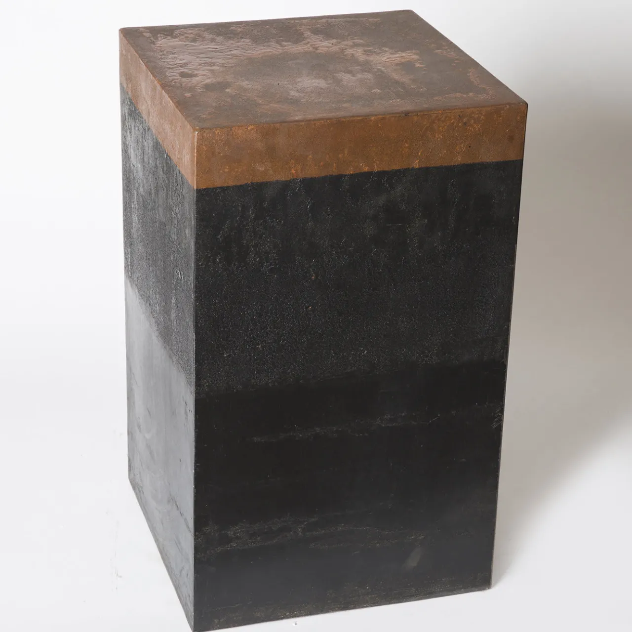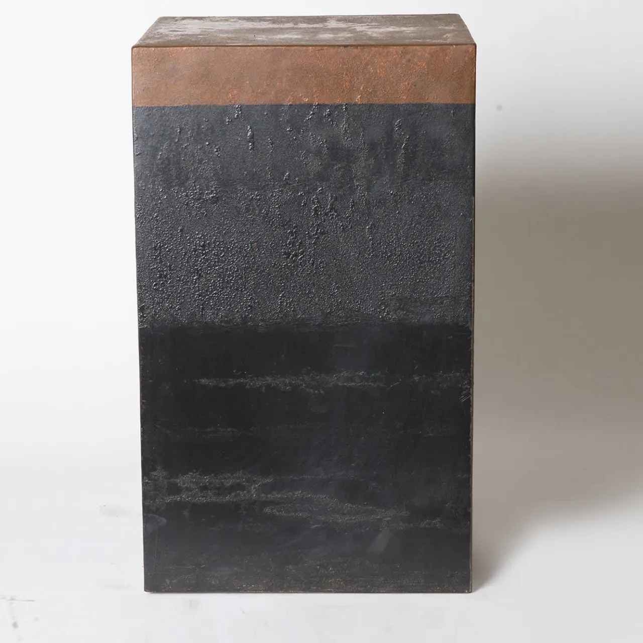 Tavolino dal design scultoreo, caratterizzato da una superficie superiore con effetto ruggine e una base verniciata in nero, rifinito con cera per una delicata luminosità. Un pezzo che unisce funzionalità e stile industriale, ideale per ambienti interni che valorizzano texture grezze e materiche.