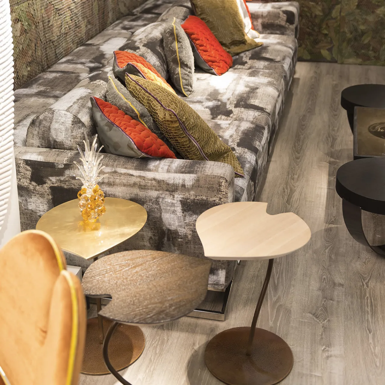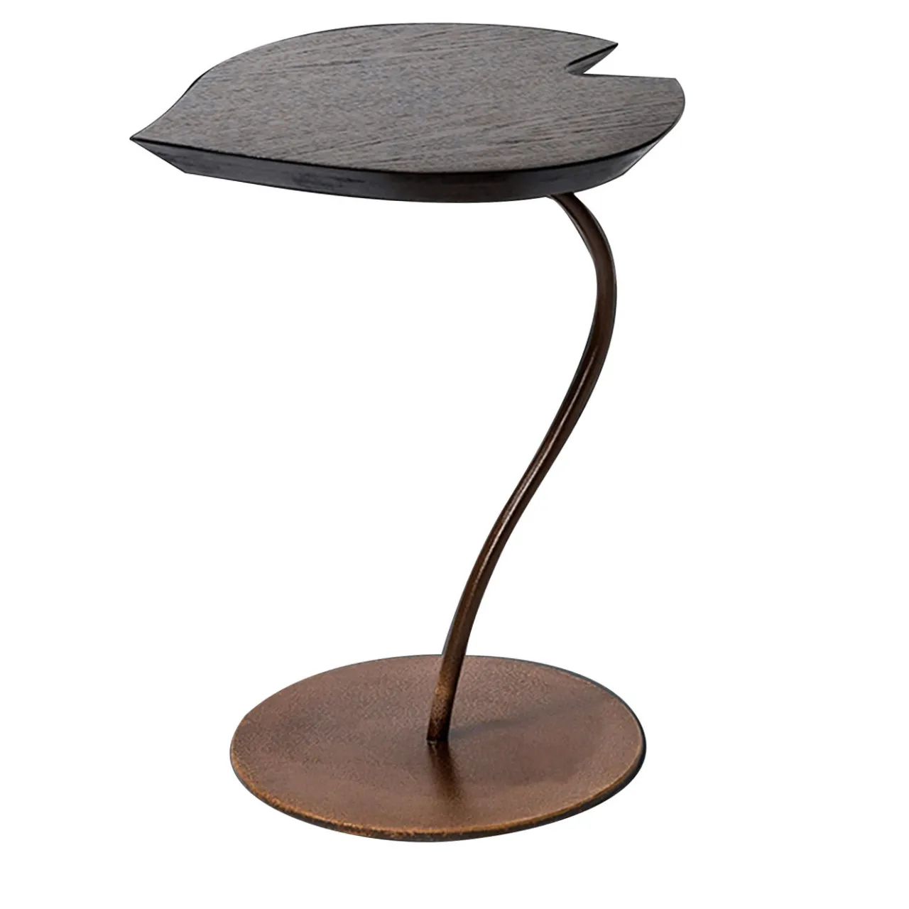 Questo tavolino contemporaneo sarà una splendida aggiunta a un soggiorno o a una camera da letto, come comodino. Una base rotonda in ferro con una sottile gamba ricurva con una calda finitura di ruggine resistente agli agenti atmosferici sostiene un piano in legno a forma di foglia con una ricca finitura color moka. Questo tavolino, che rappresenta un elemento di modernità se esposto da solo, aggiungerà spazio e stile a qualsiasi stanza. Disponibile anche con finitura in acciaio lucido e piano in metallo nero o argento.