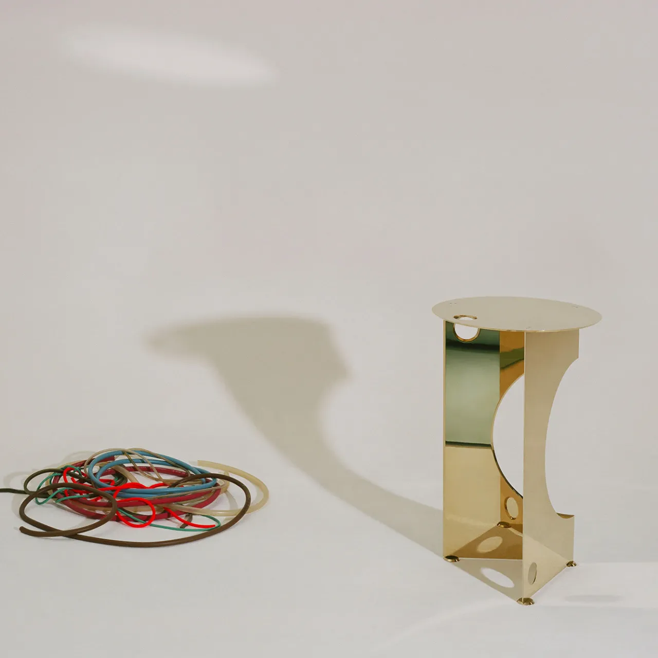 Interamente realizzato a mano, questo tavolino emana un minimalismo industriale e un’allure suggestiva derivante dalla sua lavorazione artigianale. La struttura è in ottone con una base quadrata piegata con un metodo proprietario e sostenuta da piedini ricavati a CNC da un’unica lastra di metallo. La forma rotonda dei tagli sulla base si ripete anche nel piano rotondo, per un effetto dinamico e sofisticato. A causa della produzione artigianale, questo tavolo potrebbe presentare piccole imperfezioni.