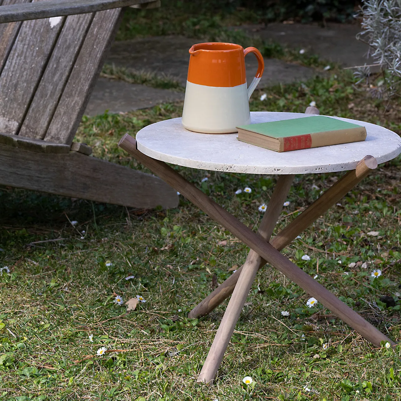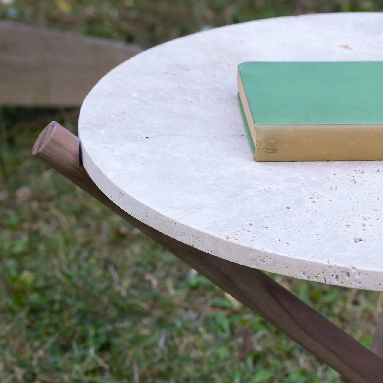 Il tavolo Naturam presenta un top circolare in travertino levigato e non intonacato, che mette in evidenza l’eleganza grezza del limestone naturale. La sua finitura morbida è protetta da trattamenti resistenti a macchie e pioggia, migliorando la durata pur preservando il suo carattere organico. Il tavolo poggia su una base scultorea a tre gambe in noce Canaletto, formata dall’intersezione di elementi in legno. Un pezzo raffinato ma terreno che fonde materiali senza tempo con una sensibilità di design contemporaneo.