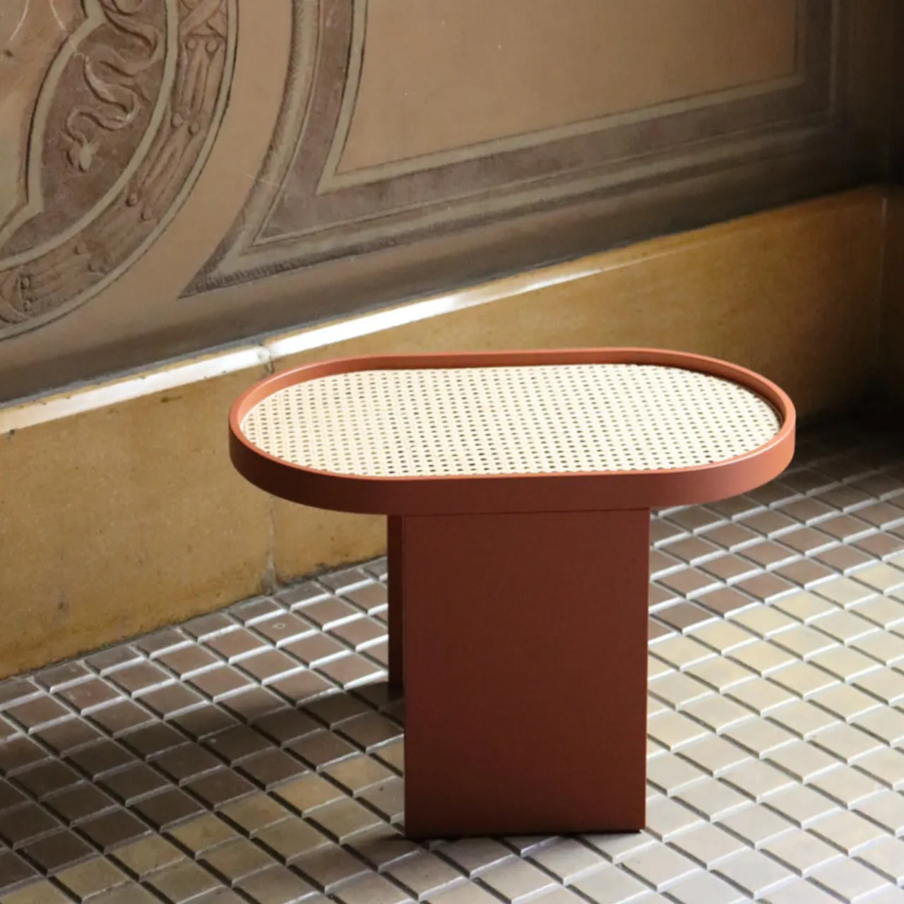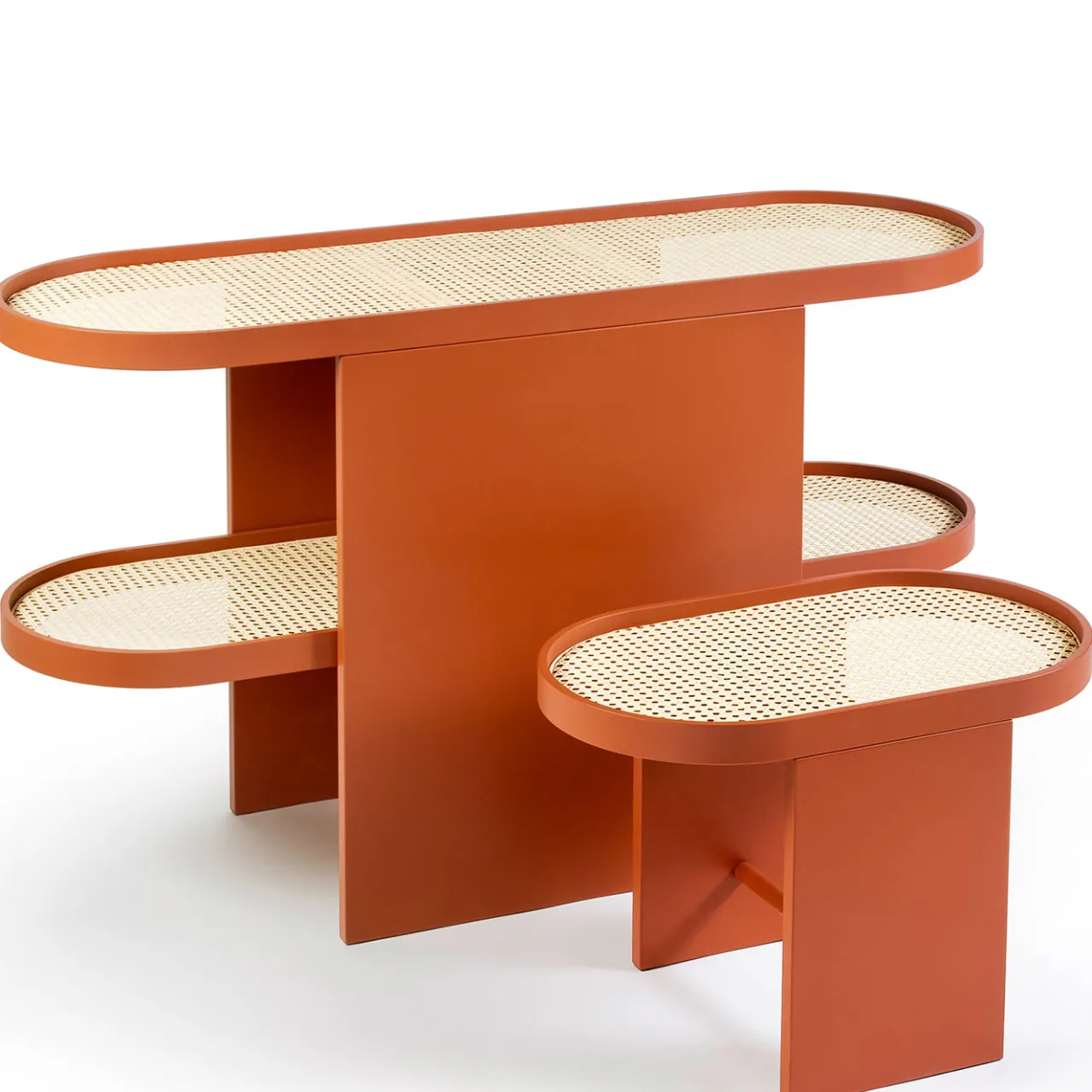 Questo tavolino disegnato da Patricia Urquiola unisce eleganza e funzionalità. Realizzato in legno con una particolare laccatura cangiante in un moderno color rame, questo tavolino bilancia un piano ovale con superficie in canna naturale tra due imponenti pannelli laterali rettangolari. L’asta centrale inferiore aggiunge stabilità a questo pezzo esclusivo che viene realizzato su ordinazione; per ulteriori dettagli e prezzi, contattare il Concierge.