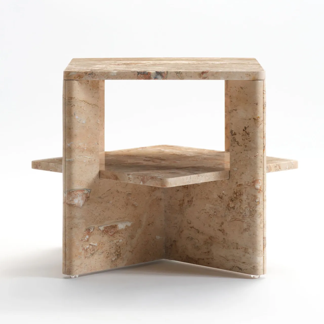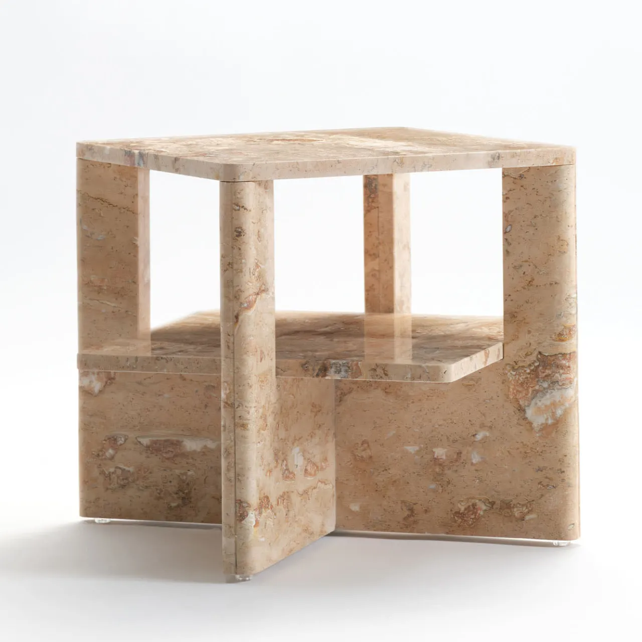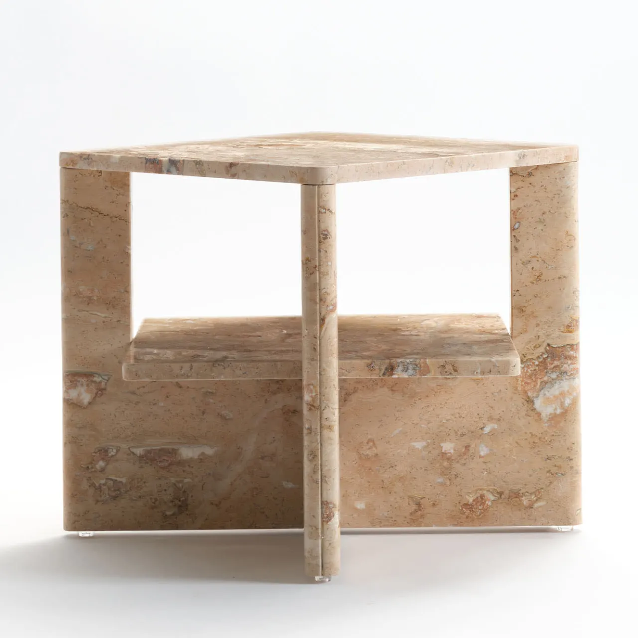 Minuziosamente scolpito da un unico blocco di travertino estratto da un’antica cava, oggi chiusa, questo tavolino è un complemento elegante per arredamenti in stile contemporaneo. Due lastre a forma di U si intersecano per sostenere sia il piano superiore che il ripiano centrale, una soluzione strutturale che permette un accattivante gioco di pieni e vuoti. Lucidato a mano, è ammorbidito da profili arrotondati. È un pezzo unico.