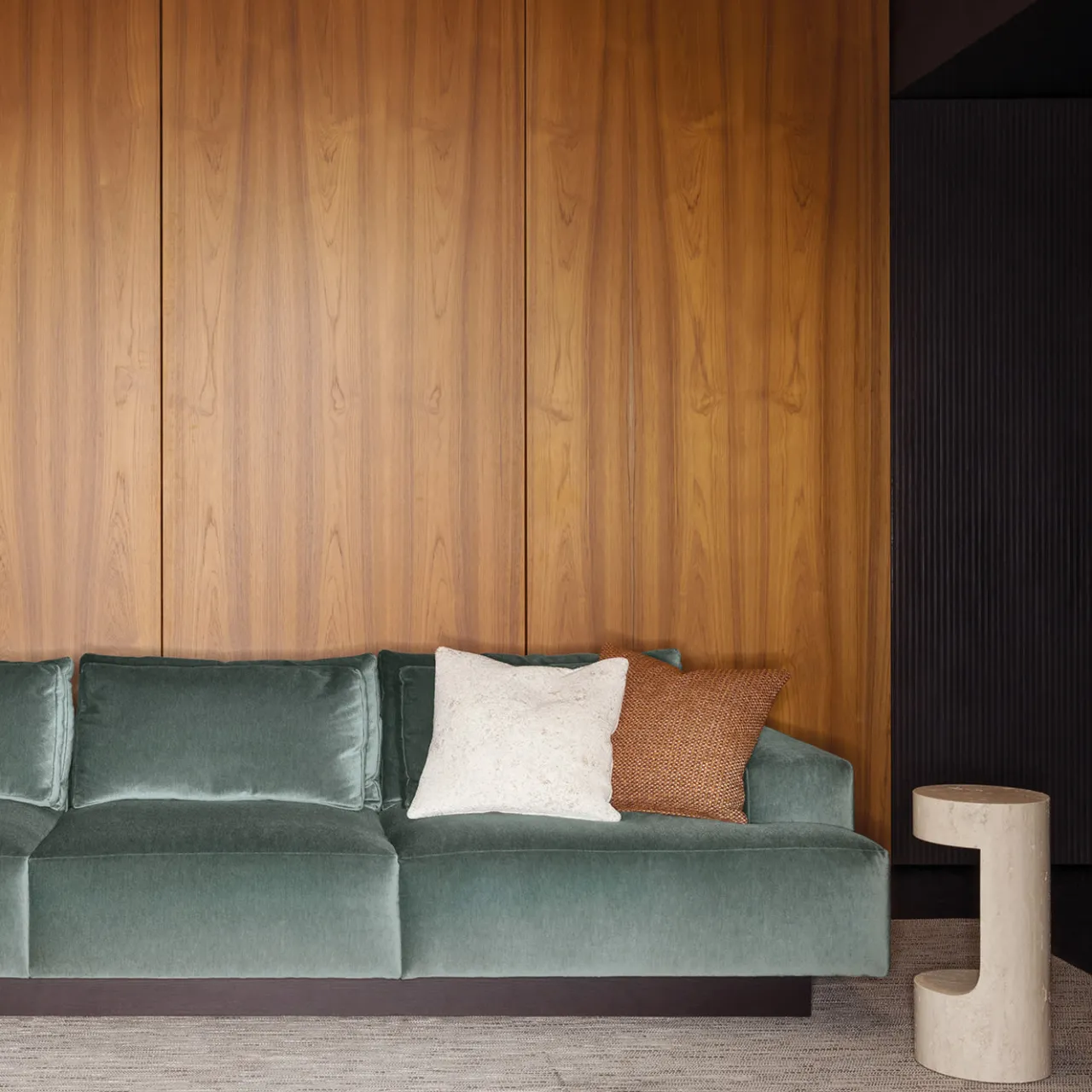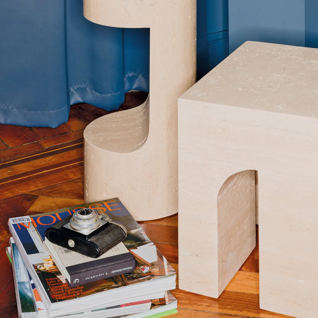 Le forme, come nel nome, sono un chiaro riferimento a uno strumento musicale a fiato. Un’impeccabile lavorazione del travertino evidenzia, nella parte scavata della gola, le caratteristiche uniche di questa pietra. Un design inaspettato che sembra espellere il peso specifico del materiale in cui è realizzato. La forma ne sottintende l’ispirazione, infatti in musica rappresenta la forma tipica di alcuni strumenti a fiato. Struttura monolitica fresata in travertino romano massiccio.