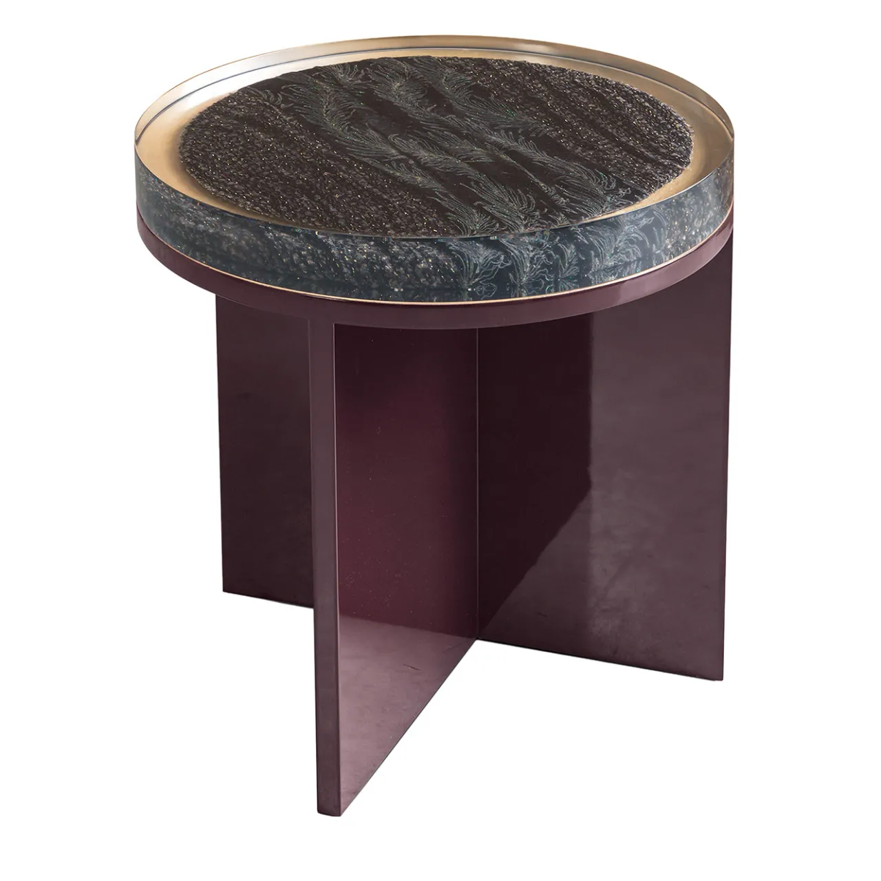 Questo tavolino presenta un piano rotondo di dimensioni medie realizzato in resina con un dettaglio di tessuto progettato su misura integrato che aggiunge profondità e texture. La base in legno laccato lucido sostiene il piano con una forma scultorea moderna composta da pannelli incrociati. Questo design fonde materiali innovativi con una silhouette elegante, rendendolo un pezzo distintivo per interni contemporanei.