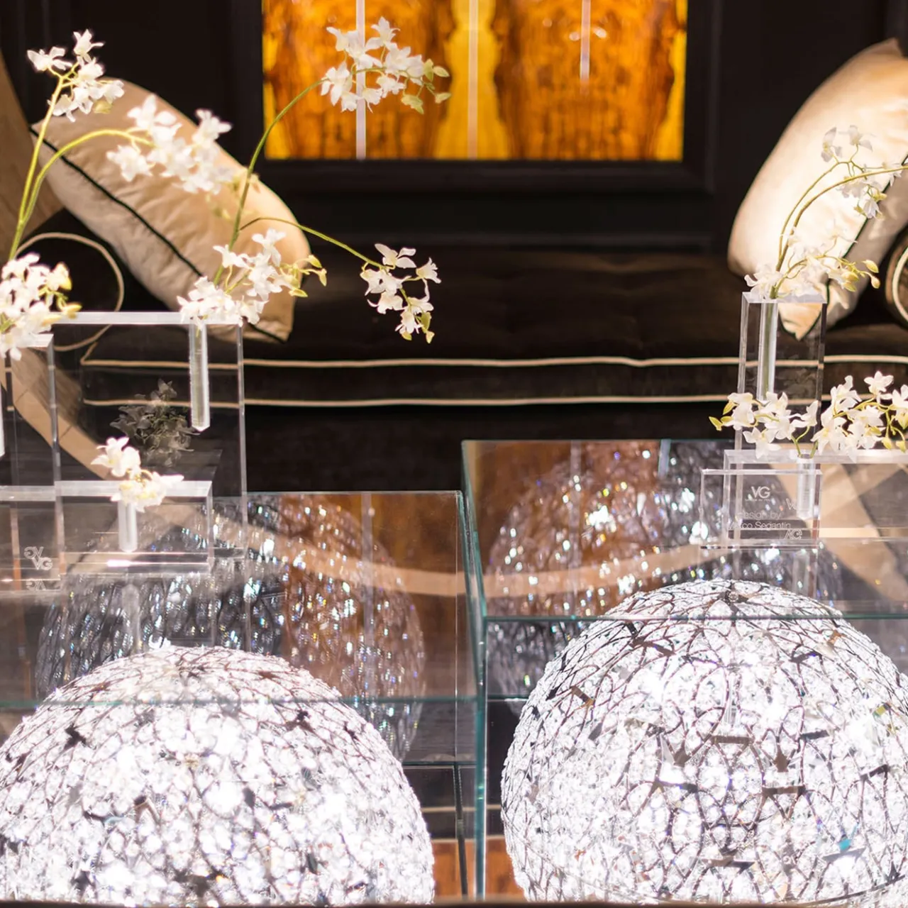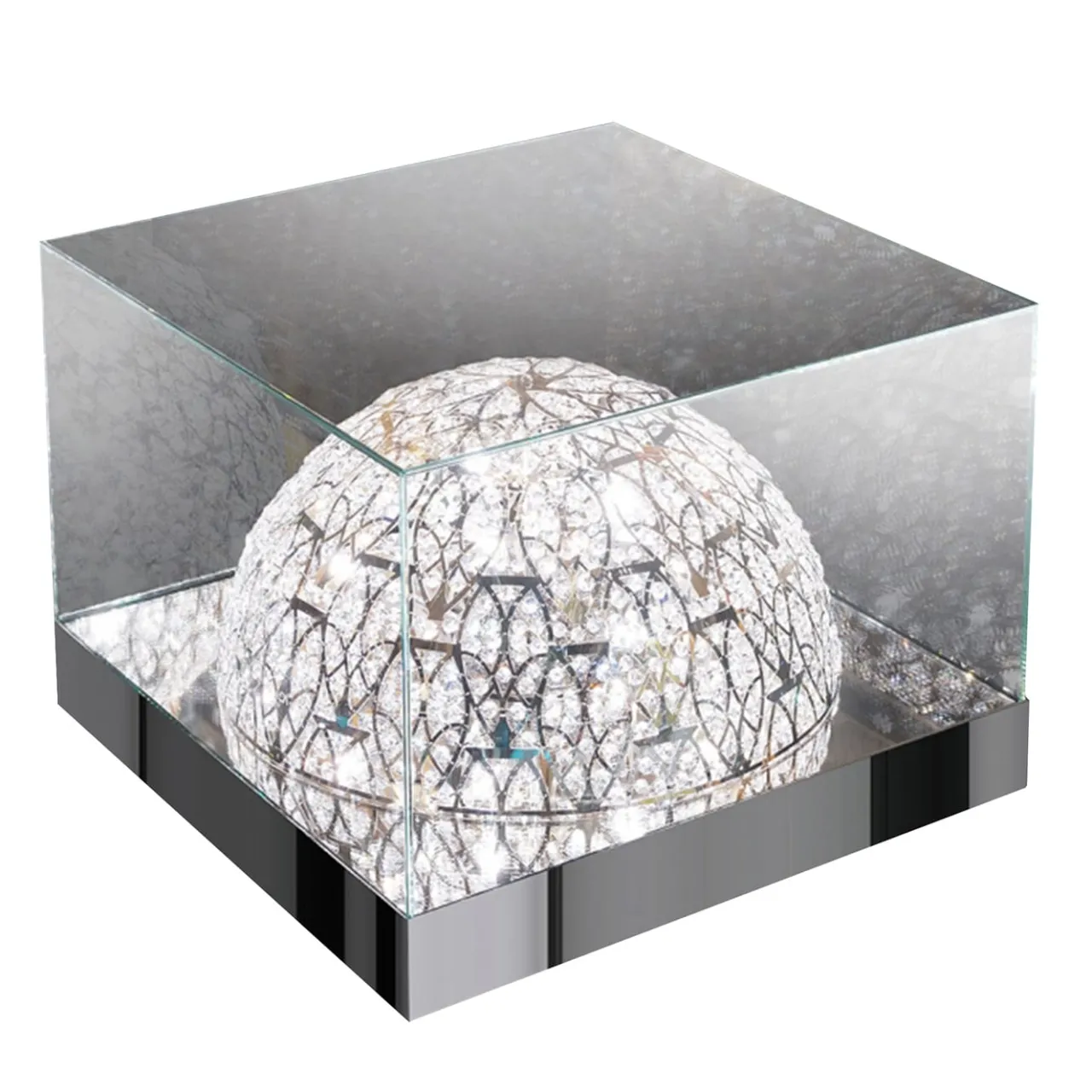 Un ibrido tra una scultura luminosa e un tavolino d’appoggio, questo design catalizzerà l’attenzione ovunque venga collocato grazie al suo fascino etereo. Dal globo semisferico – caratterizzato da una struttura in acciaio arabescata e traforata, arricchita da cristalli – si irradia un bagliore ipnotico, intrappolato e rivelato dal volume squadrato in vetro trasparente.