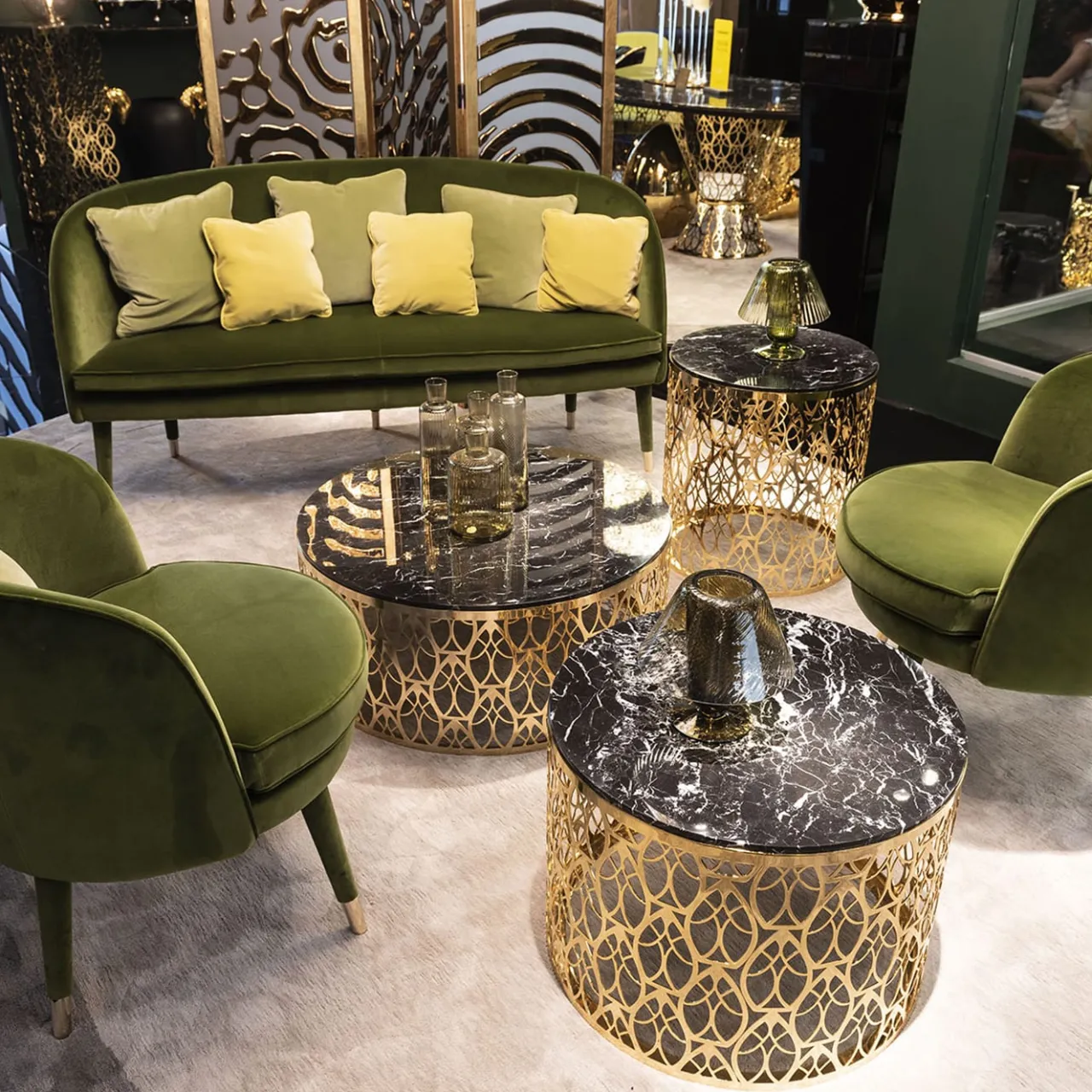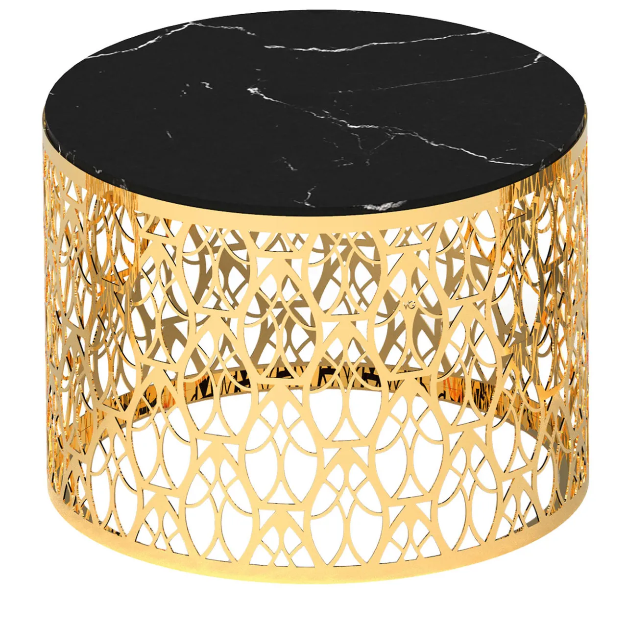 Complemento iconico e audace di un ambiente elegante, questo tavolino fa parte di una serie di tavolini dal carattere maestoso e opulento. Di forma arrotondata, presenta una base in metallo dorato di ispirazione arabeggiante, sormontata da una superficie in marmo nero. Disponibile in altre dimensioni, consultare il catalogo Artemest per le opzioni.