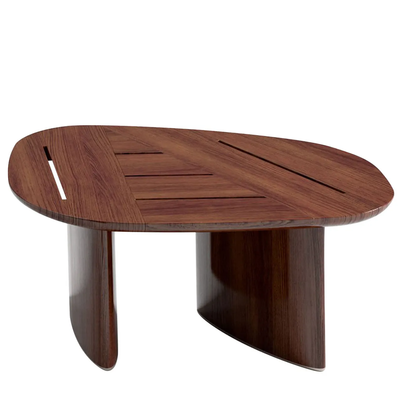 Tavolino medio in mogano Sapeli lucido. Dettagli metallici in acciaio spazzolato.
