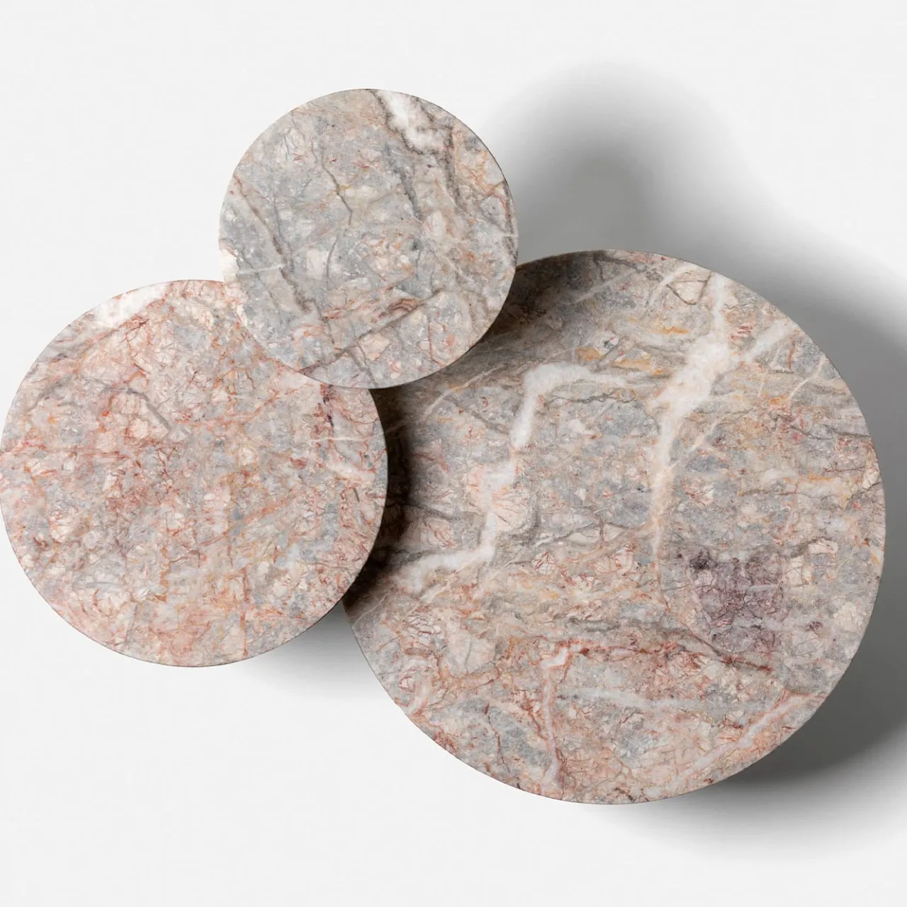 La collezione Mirage nasce dalla matericità monolitica della pietra. Forma e funzione coincidono, creando un elemento senza fronzoli, che nasce dalla sottrazione di materiali. Pieni e vuoti si alternano e creano sfumature di luce che si dissolvono grazie alla giustapposizione dei decori. Questo tavolino ha un dettaglio in ottone/rame che definisce il collegamento tra la base e il piano in marmo Fior di pesco carnico. Questo oggetto ha fatto parte della , esposta presso fino a maggio 2023.