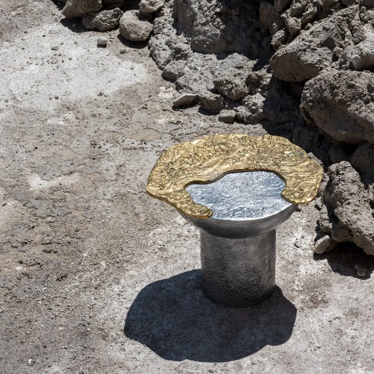 Realizzato in 80% di alluminio riciclato e bronzo tramite fusione a cera persa, il tavolo Mooncrater è un testamento all’origine della vita—un paesaggio testurizzato formato da detriti e residui. Fatto a mano in Italia, personalizzabile nelle dimensioni, aggiunge un tocco dinamico agli interni. Le opere d’arte in metallo fuso di Wanderart sono tutte fatte a mano, quindi dimensioni e peso possono variare. Rappresentato dalla galleria Marion Friedmann.
