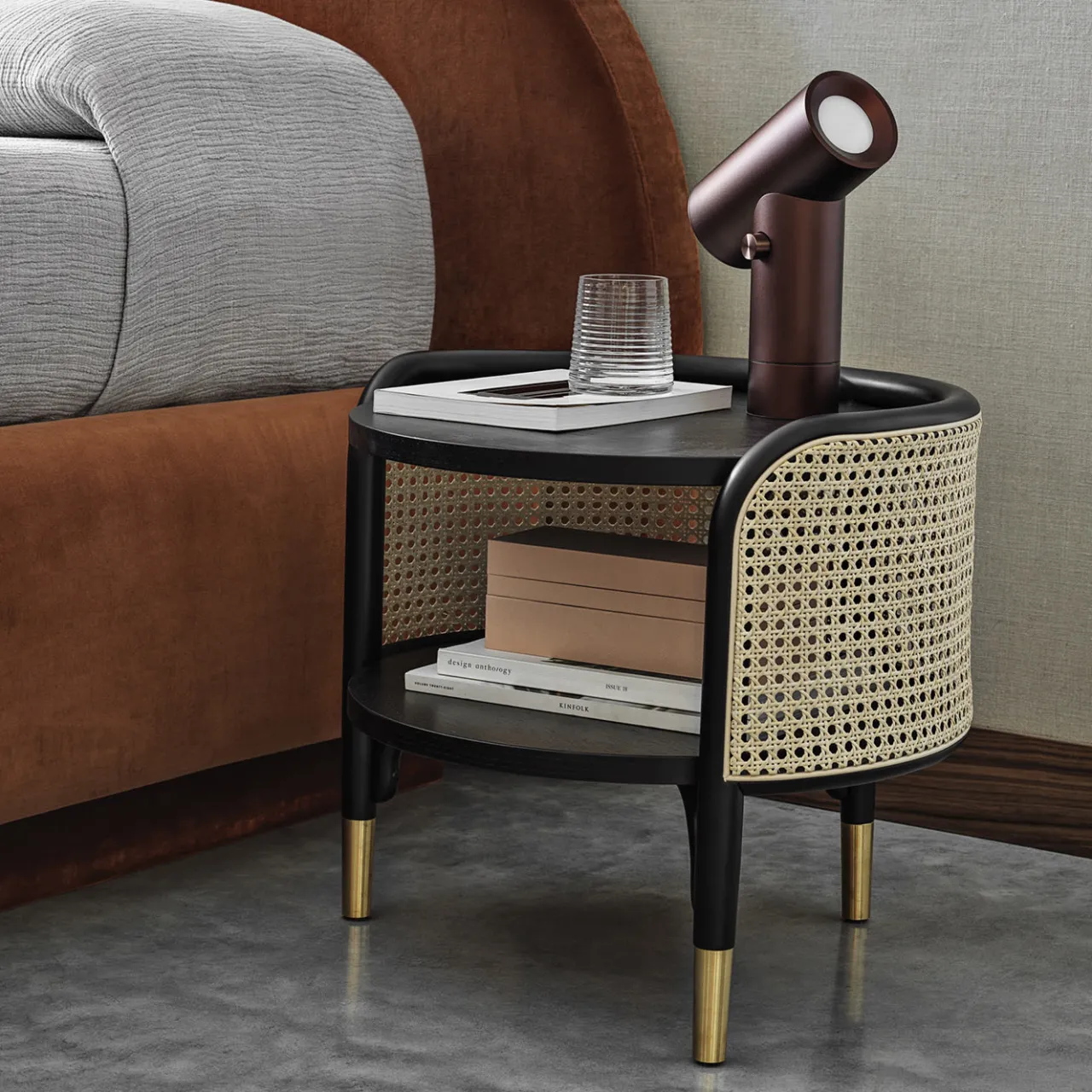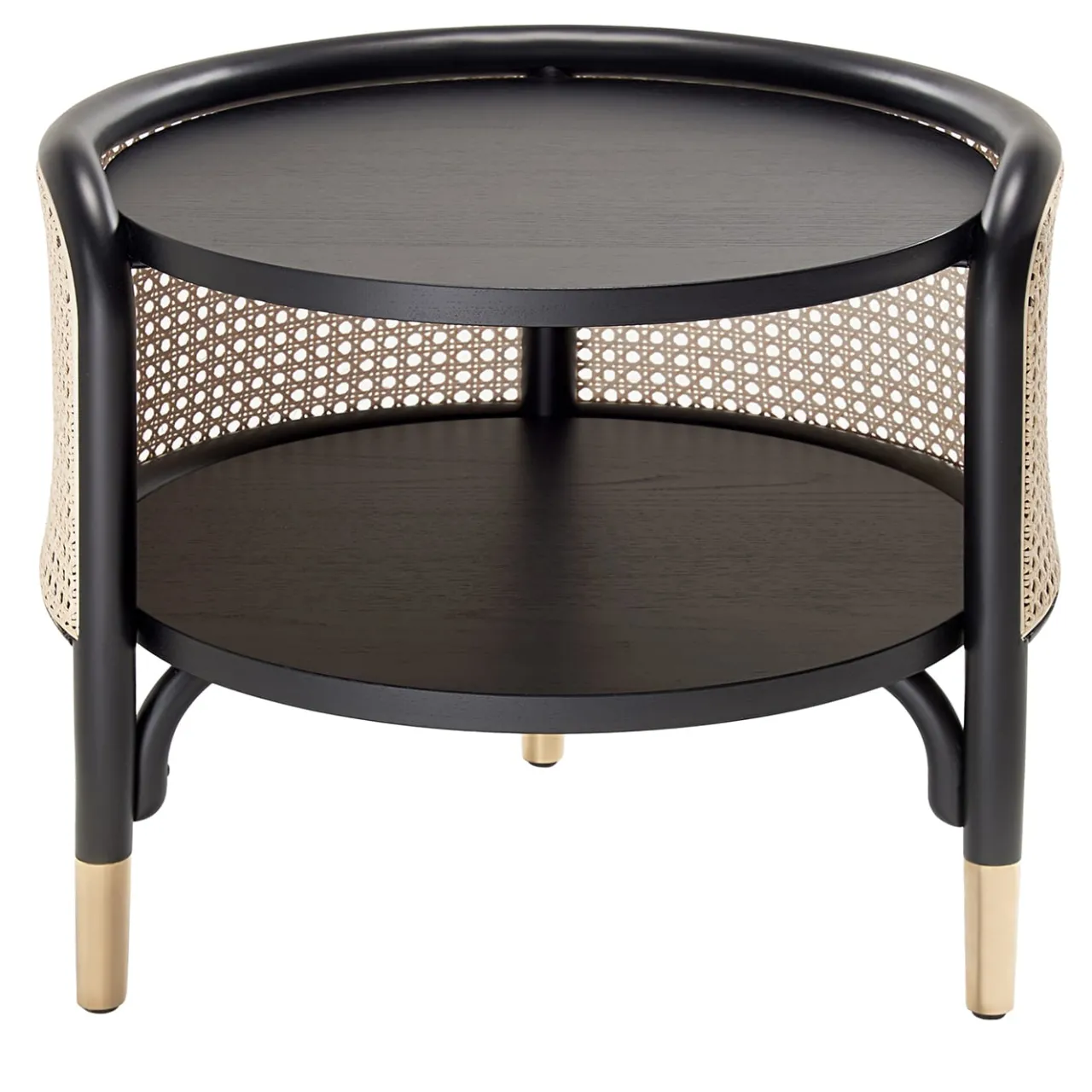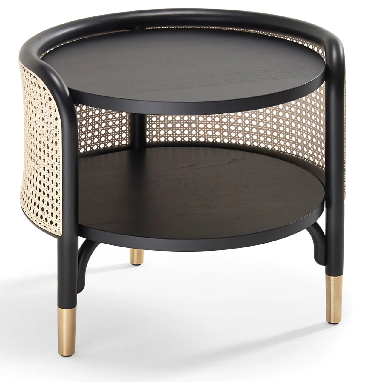 Disegnato dal duo di architetti GamFratesi, questo splendido tavolino fa parte di una serie di oggetti d’arredo raffinati e moderni che comprende anche una consolle, un mobile e una libreria. Utilizzabile come tavolino da salotto o comodino, il suo design arioso ed elegante è realizzato artigianalmente in legno di faggio curvato e laccato nero e paglia di Vienna. L’intero pezzo poggia su piedini in ottone. Disponibile in finitura naturale su richiesta al Concierge.