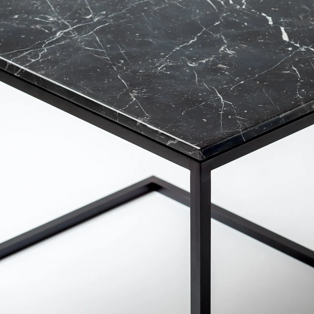 Parte di un’opulenta ed elegante collezione di tavolini e tavolinetti disegnati da Antonio Saporito, questo squisito pezzo è una testimonianza di estetica minimalista e di raffinata artigianalità. Prende il nome dal favolista greco Esopo ed è caratterizzato da un ipnotico piano in marmo Black Marquina con venature bianche naturali, sostenuto da una base in ottone laccato nero con una composizione altamente geometrica di tre gambe.