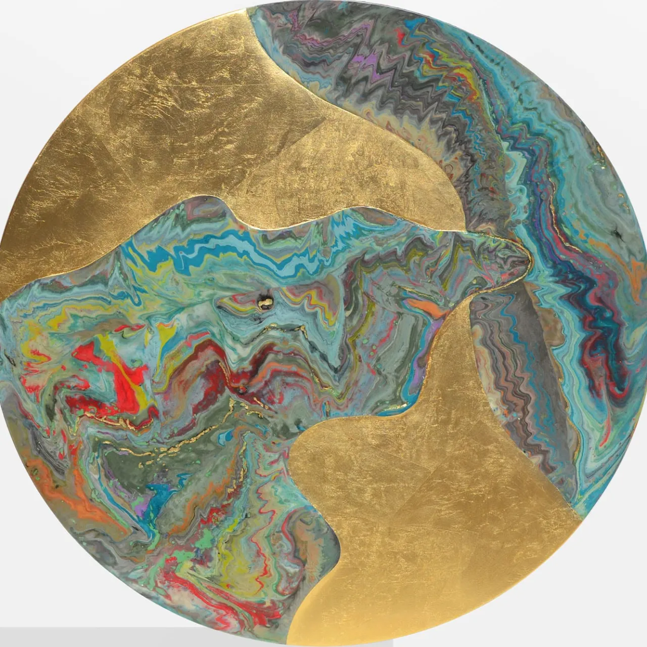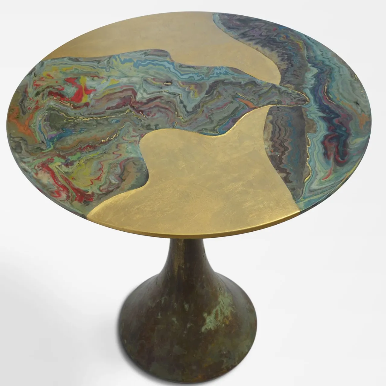 Ossidi policromi e foglia d’oro scintillante compongono l’intrigante e irripetibile decorazione manuale che caratterizza questo tavolino unico. Montato su un disco Fenix, il piano sigilla l’armoniosa silhouette la cui base in metallo sfoggia una dinamica forma a tromba decorata in ceramica. Ricco di estro artistico, il pezzo è disponibile anche in una versione più alta, disponibile nel catalogo Artemest.