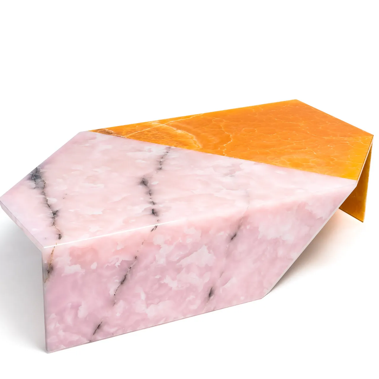 Come se il marmo fosse carta, la collezione di tavoli living si ispira agli antichi origami giapponesi: il piano del tavolo si piega a 90° diventando il supporto verticale, in un gioco grafico di continuità e colore. Grazie al design eclettico di Patricia Urquiola e alla collaborazione con i magistrali esperti di Budri, le due pietre utilizzate – onice rosa e onice Nuvolato – si piegano a 90° per creare sia il piano che il suo supporto. La delicata combinazione di colori contrasta con la silhouette contemporanea di questo pezzo audace, che sarà un elemento di spicco in qualsiasi arredamento.