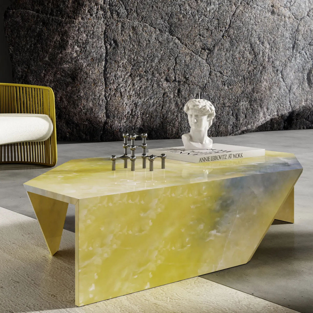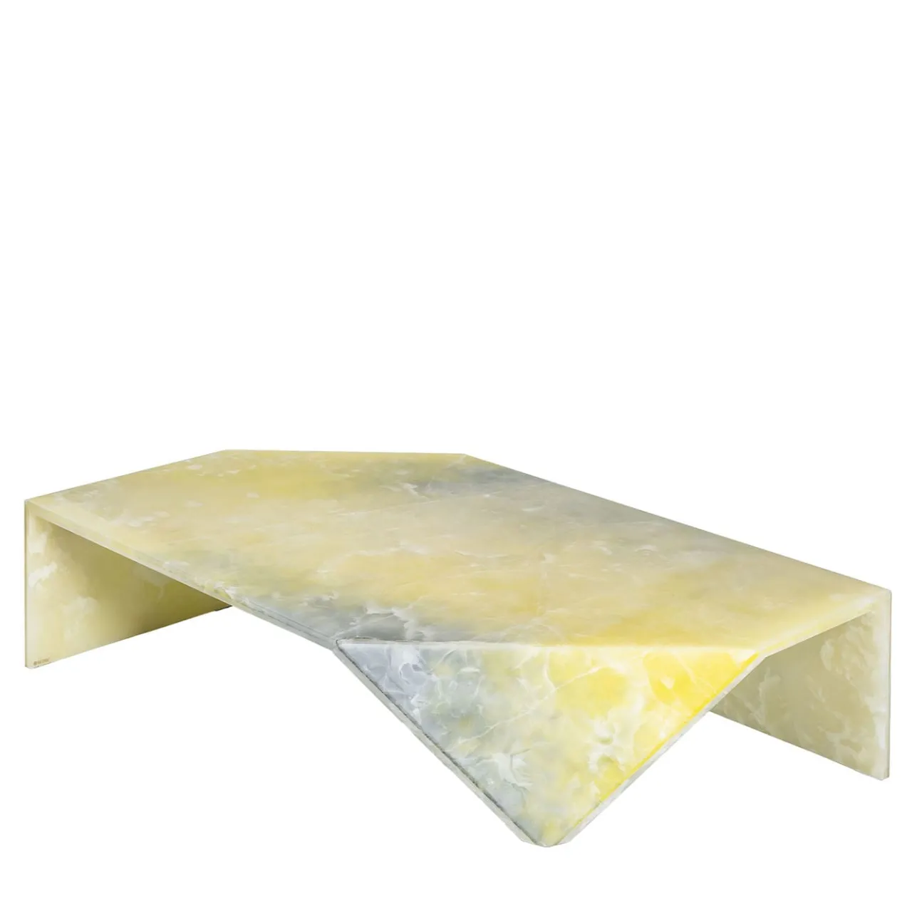 Rigorosamente piegato per creare una struttura autoportante poeticamente ispirata all’arte degli origami, questo tavolino da caffè è realizzato in pregiata onice bianca iraniana e incanta con le sue vibranti sfumature di giallo pulcino, verde lime e blu, ottenute con un abile processo di acquerello manuale. L’imprevedibile motivo a nuvola che l’onice sfoggia naturalmente sottolinea ulteriormente la sua unicità.