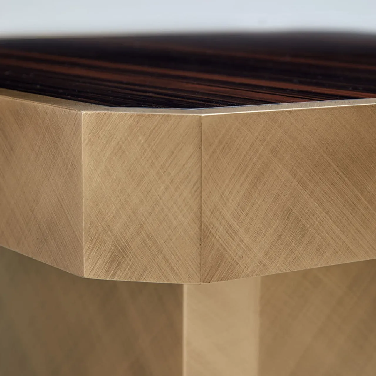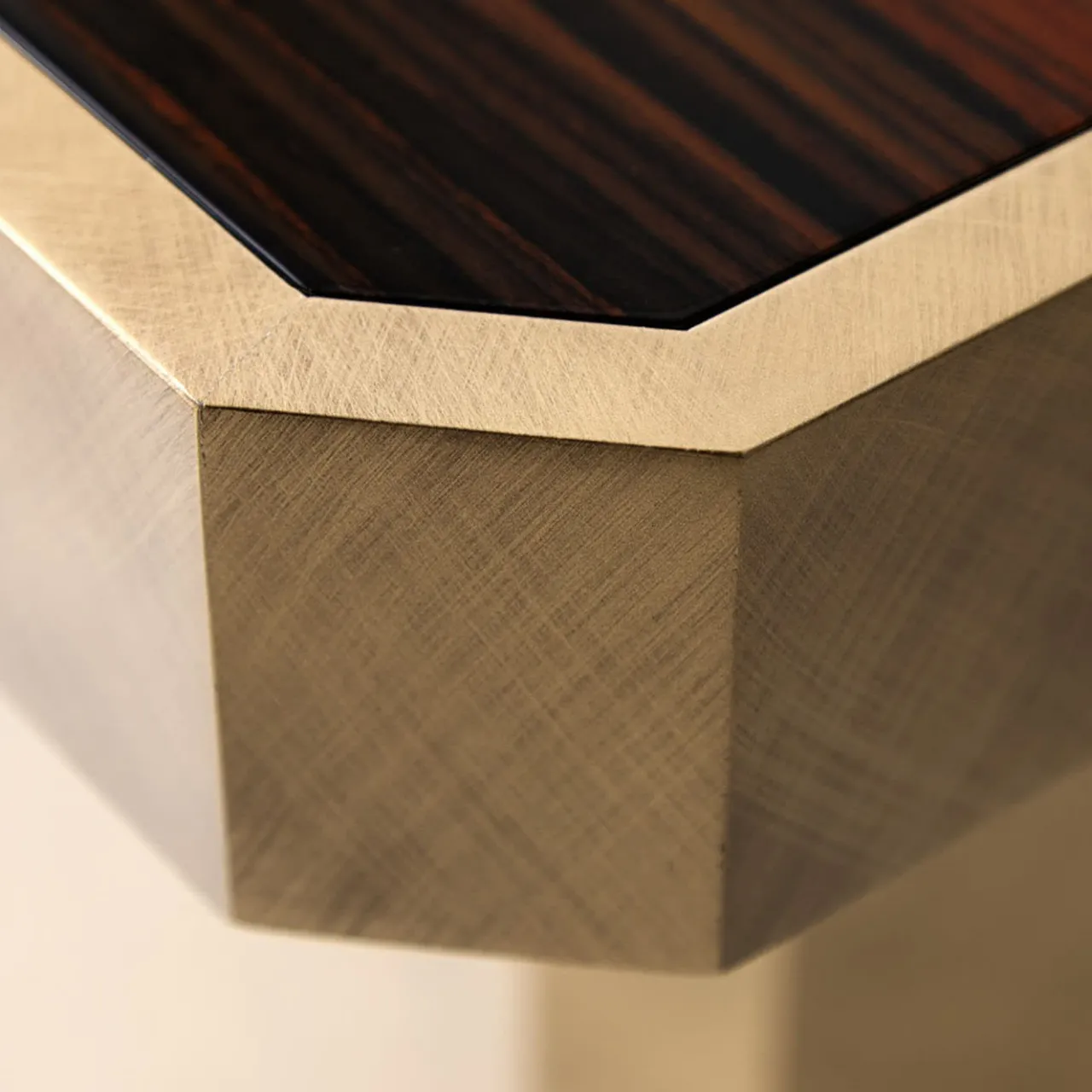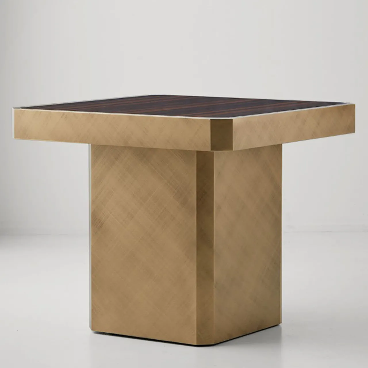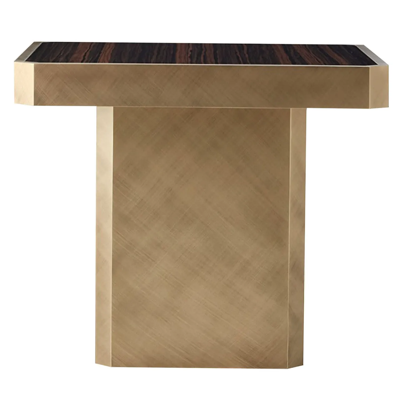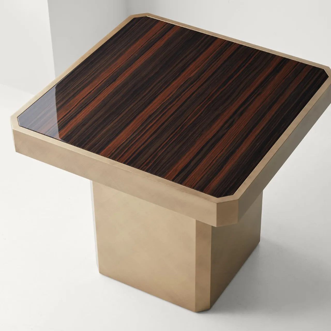 Tavolino quadrato Carmine con piano in legno Ebano Macasar lucido e base in metallo laccato Bronzo.