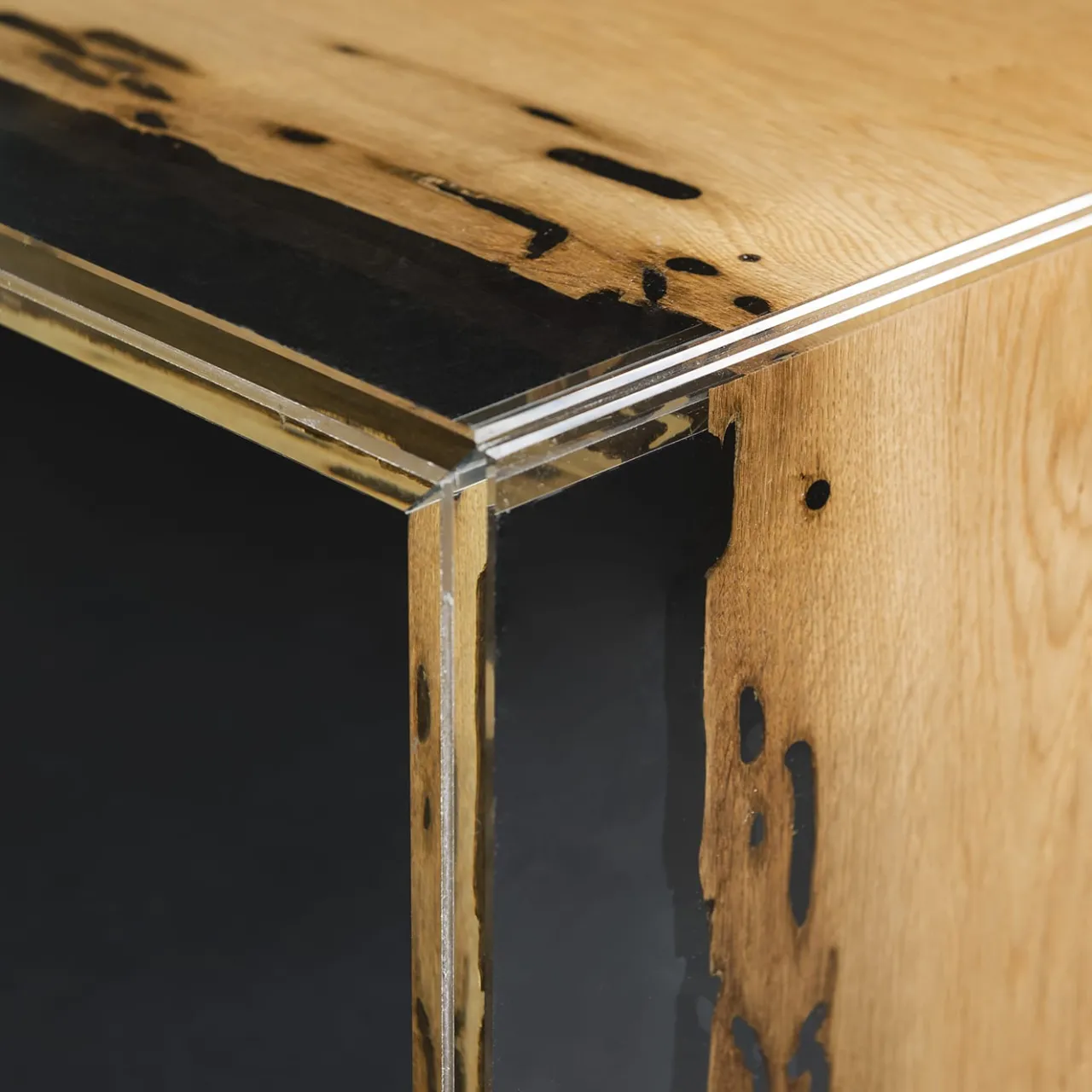 Parte della sofisticata Glass&Wood Collection, questo tavolino deve la sua natura irripetibile alle lastre di legno – ricavate da autentiche briccole, le palafitte utilizzate nella laguna di Venezia per gli aiuti alla navigazione – intrappolate nella sua struttura in vetro trasparente e minimalista. Questo elegante design è la soluzione ideale per portare un tocco autentico di Venezia nelle case contemporanee.