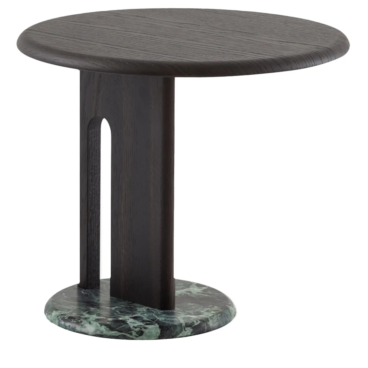 Questo tavolino rotondo presenta un top in impiallacciato di rovere pressato a membrane con una raffinata finitura laguna. La struttura è realizzata in rovere massello tornito che sostiene una robusta base circolare in autentico marmo alpino verde, combinando eleganza naturale e design moderno per un uso versatile negli spazi abitativi.