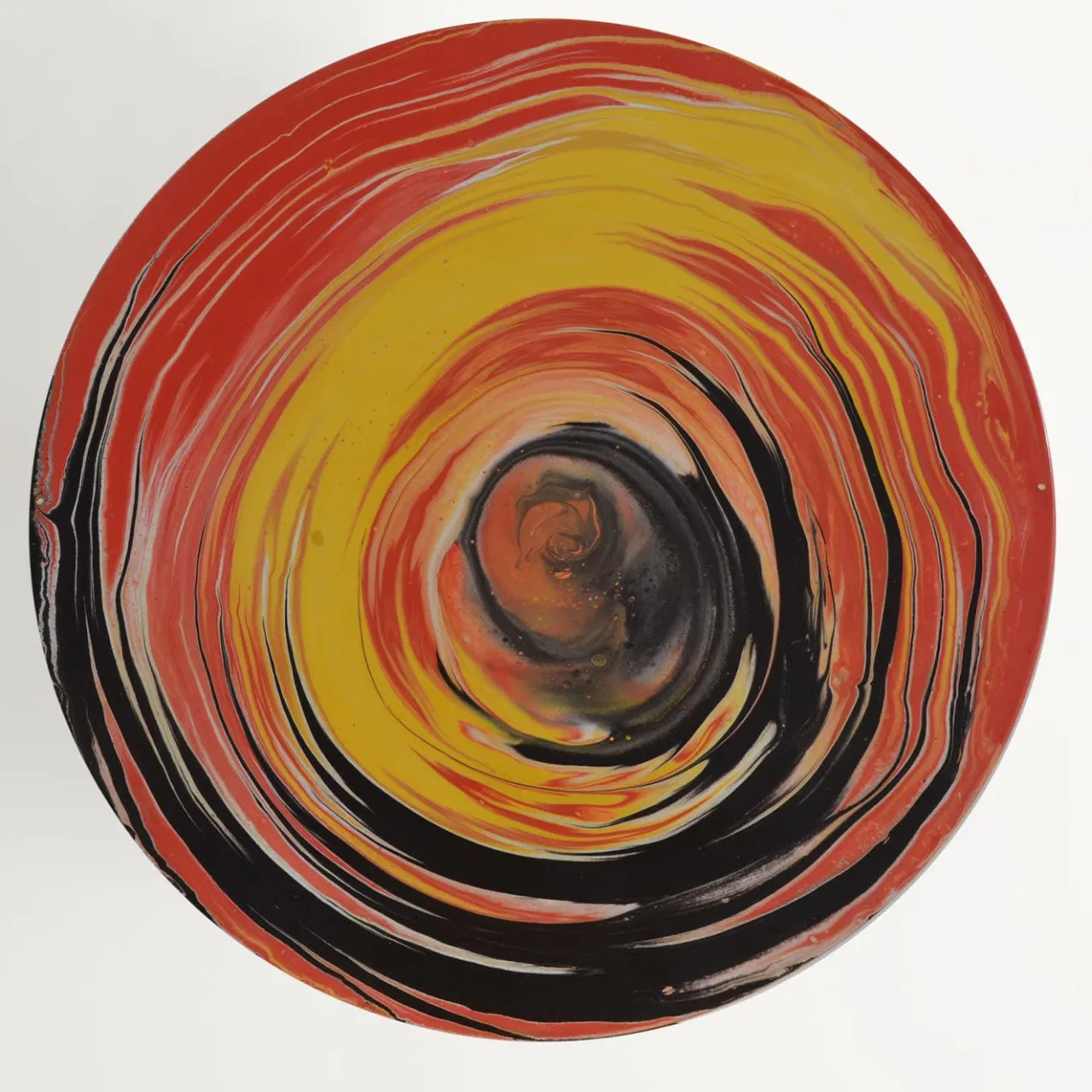Autentico oggetto d’arte realizzato e decorato a mano, questo tavolino appartiene alla poetica serie Astraliti, ispirata alla contemplazione dell’universo. Un vortice in cui vibranti tonalità calde si combinano con i toni del bianco e del nero conferisce al piano Fenix un aspetto ipnotizzante, mentre un vivace motivo a macchie rosse sottolinea l’audace base in cemento collegata al piano dal tondino in metallo nero lucido a contrasto.