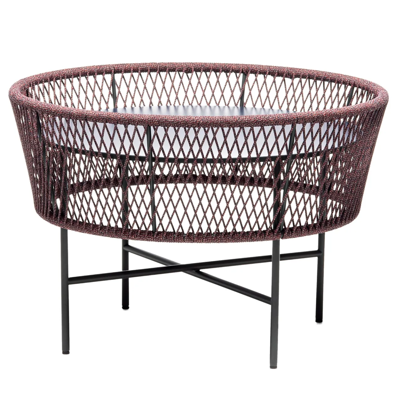 Soluzione intelligente per completare un patio sofisticato, questo tavolino permette di raccogliere bicchieri e servire tartine con una superficie artistica come sfondo. Il motivo a diamante di corde marine intrecciate è abilmente eseguito a mano, legandole ai bordi del volume a tamburo che caratterizza il pezzo. Tutti gli elementi sono interconnessi dalla struttura generale in acciaio verniciato a polvere in grigio antracite. Altri colori e dimensioni sono disponibili nel catalogo Artemest.