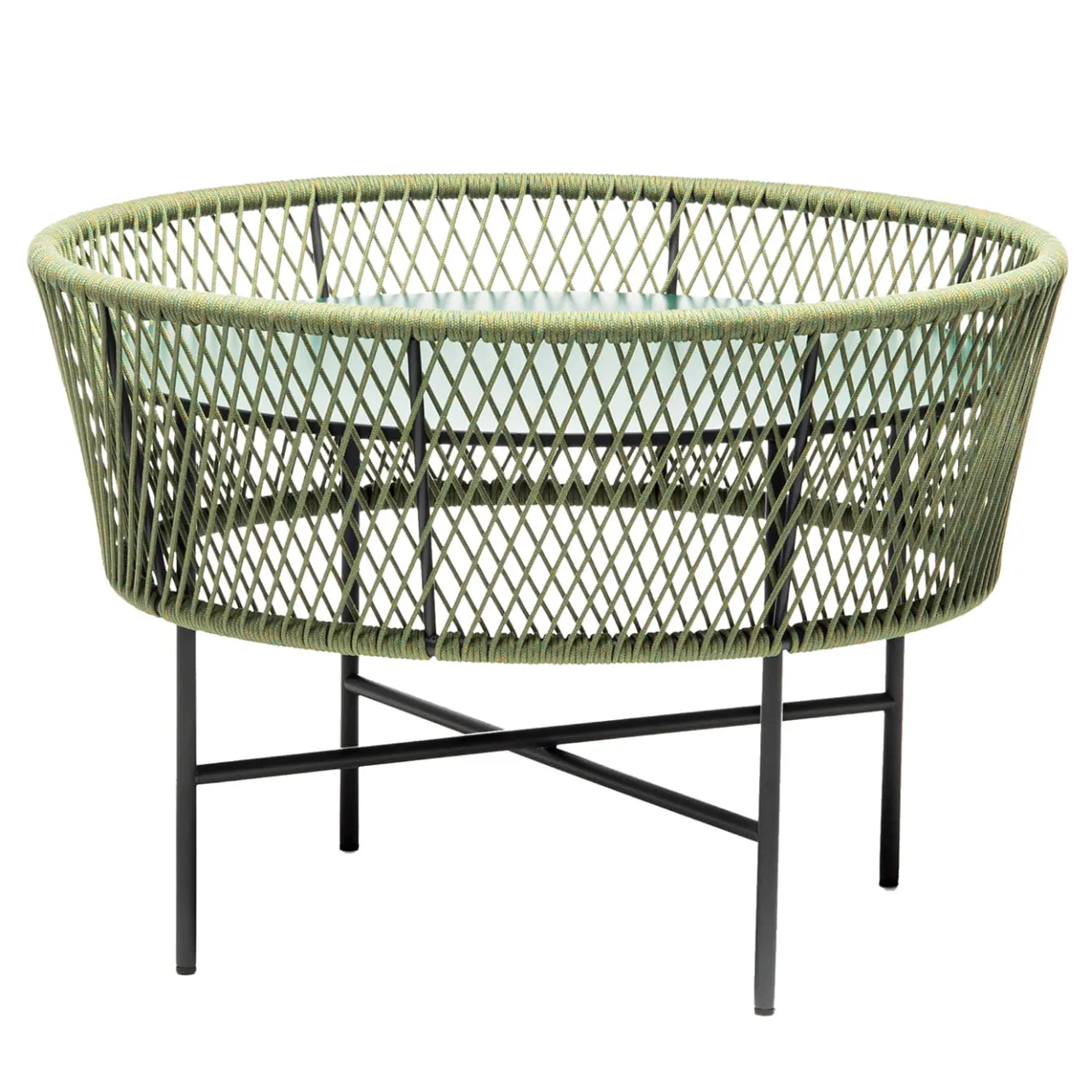 Fresco complemento per un giardino, una terrazza o un patio, questo tavolino incarna l’incontro tra ispirazioni lontane per un look eclettico e armonioso. L’elemento chiave è il motivo a diamante dell’intreccio di corde marine abilmente avvolte a mano e legate ai bordi del guscio a forma di tamburo. Il piano circolare in HPL incastonato all’interno è rivelato e nascosto da questo elemento svasato, sostenuto da gambe lineari realizzate in acciaio e verniciate a polvere in colore antracite. Altri colori e dimensioni sono disponibili su richiesta.