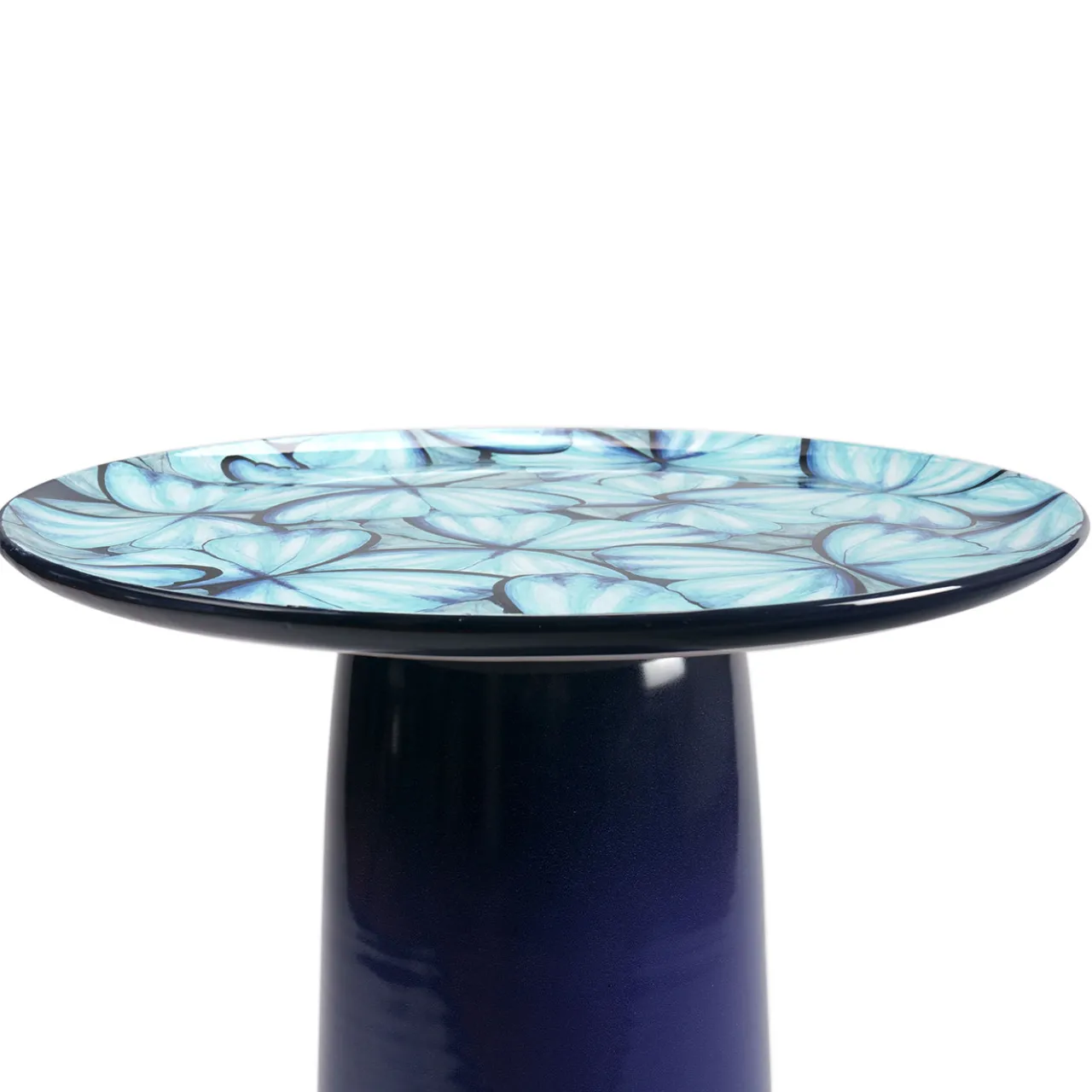 Ispirato all’eleganza delicata della farfalla blu, simbolo eterno di trasformazione e gioia, questo tavolino unisce raffinato stile artistico a un design funzionale. La superficie in maiolica smaltata mostra pennellate stratificate che spaziano dal tenue azzurro cielo al profondo blu notte. Composto da due elementi — piano e base — si monta facilmente tramite una vite in acciaio inox inserita in un giunto di faggio tornito e oliato, garantendo stabilità nel tempo. Ogni pezzo, numerato singolarmente, fa parte di un’edizione limitata di 50 unità. Essendo completamente realizzato a mano, ogni tavolo presenta leggere variazioni che ne esaltano l’unicità e la maestria artigianale.