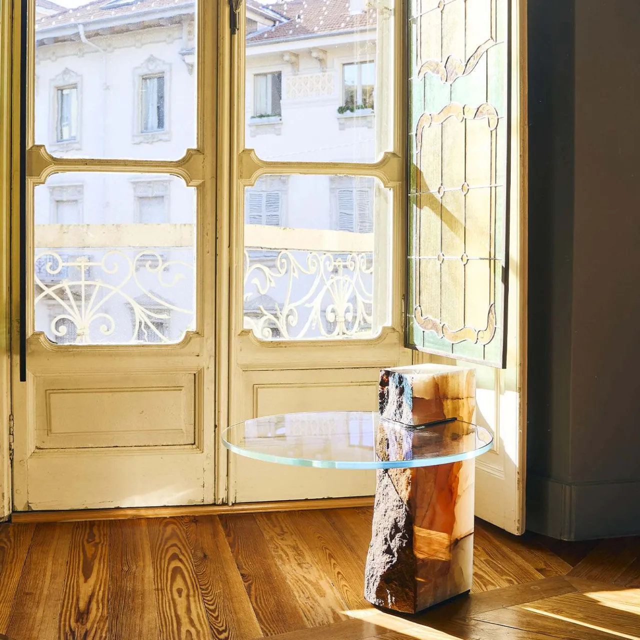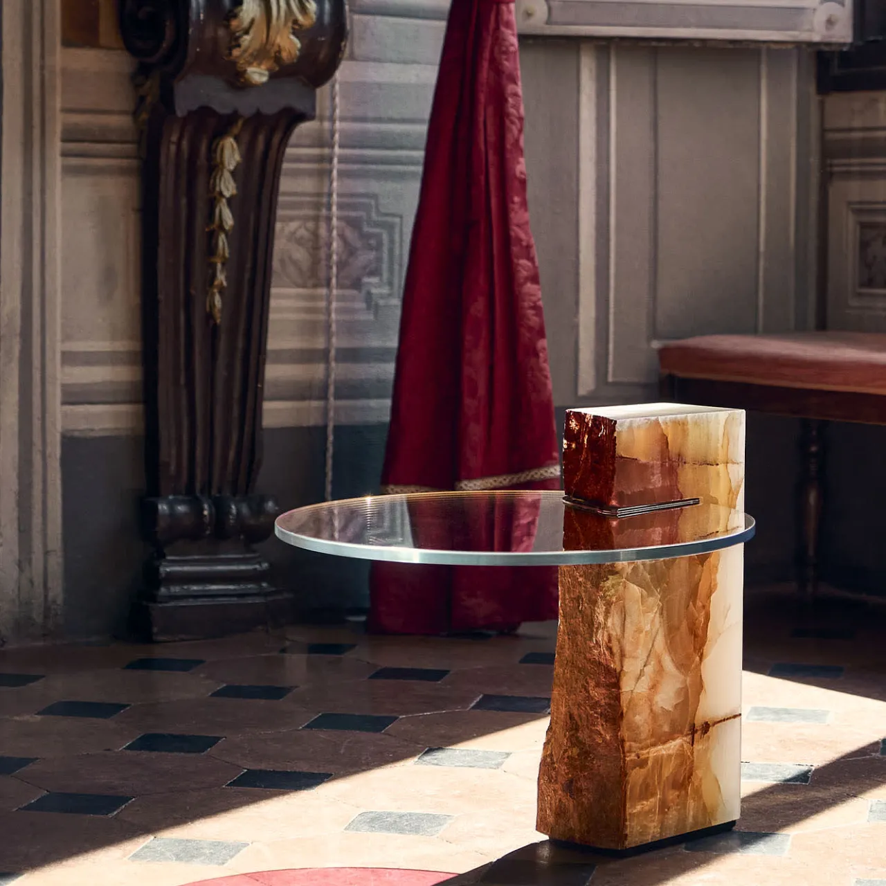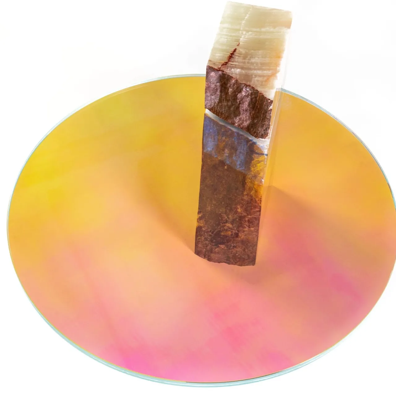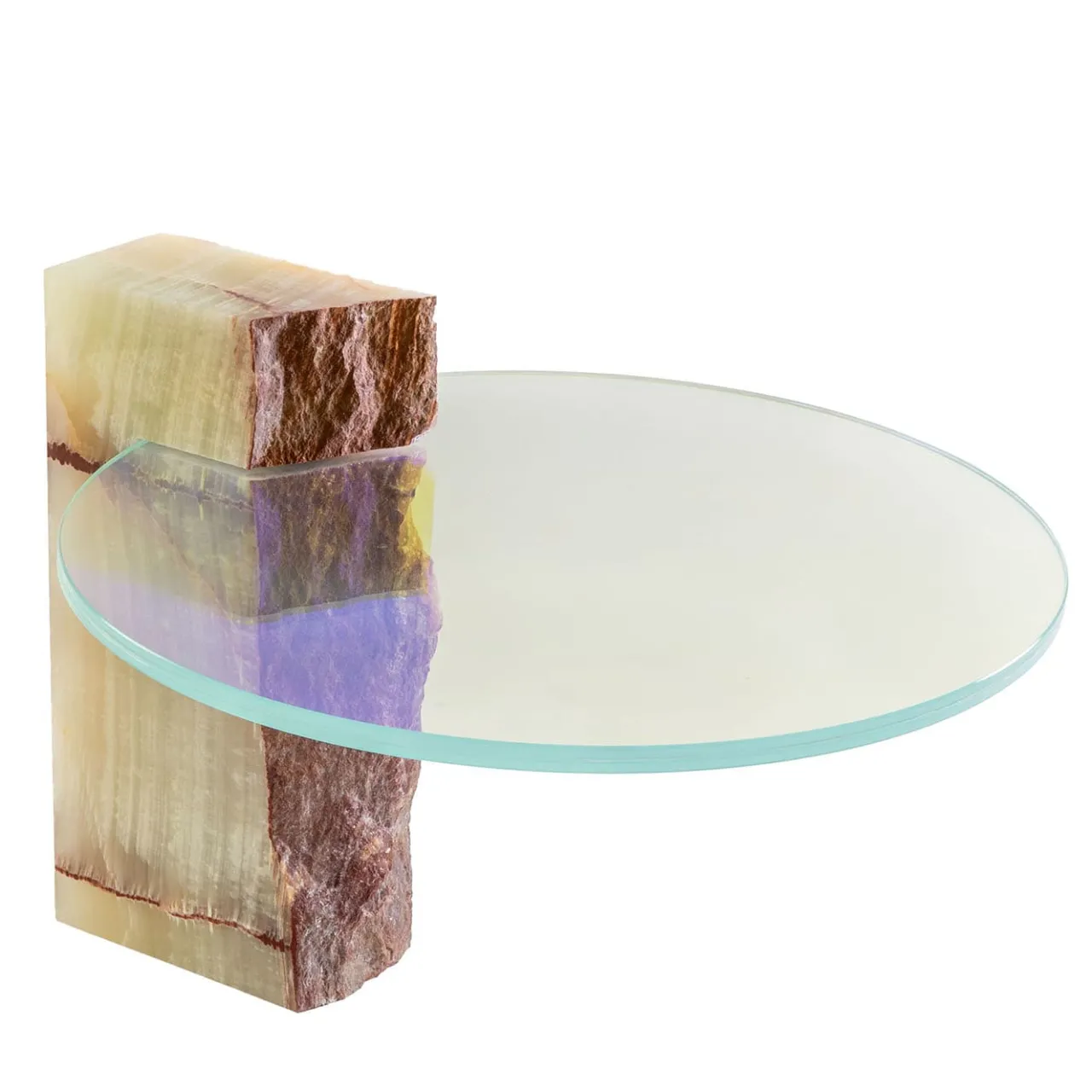 Celebrazione della squisita artigianalità, questo tavolino è una sintesi sublime di materiali pregiati e volumi essenziali. Un disco di 50 cm di diametro realizzato a mano in vetro dicroico – che rivela un trionfo di sfumature diverse al variare dei riflessi della luce – è incastonato in un’audace scocca in pregiato onice proveniente dalle regioni dell’Afghanistan e dell’Iran. Elegante e colorato, trova una collocazione ideale in raffinati contesti contemporanei.