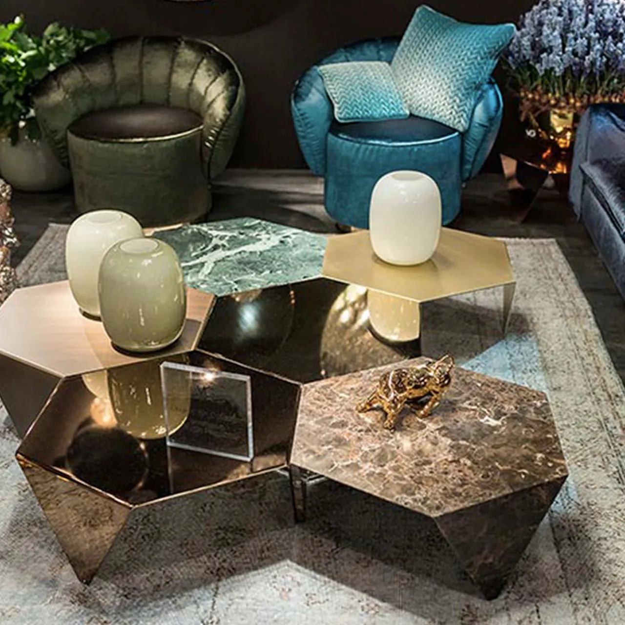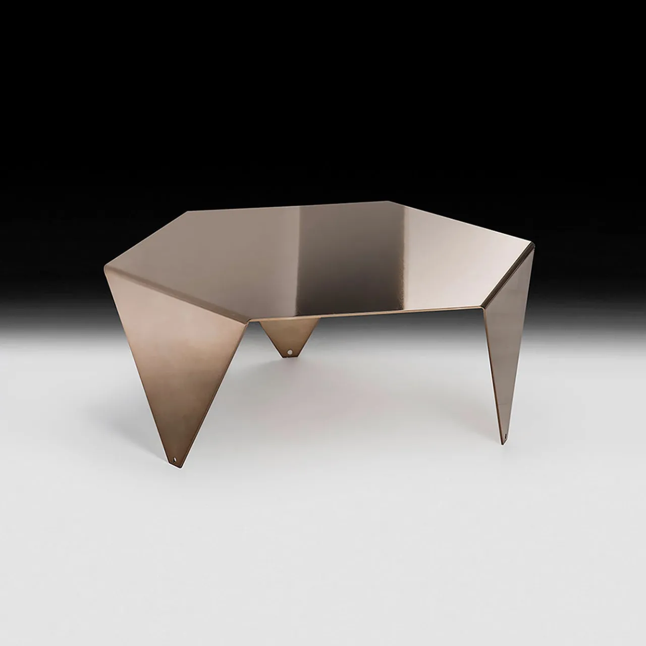 Semplicità delle forme e materiali di grande effetto si fondono in questo superbo tavolino da caffè che completerà qualsiasi arredamento contemporaneo. Realizzato in acciaio inox zincato tagliato al laser nella sua forma esagonale, presenta tre gambe che scendono senza soluzione di continuità dal piano del tavolo per formare un triangolo rovesciato. Il risultato è una struttura puramente geometrica che può adattarsi a diversi ambienti. Può essere combinato con altri tavoli della stessa collezione per creare soluzioni d’arredo accattivanti.