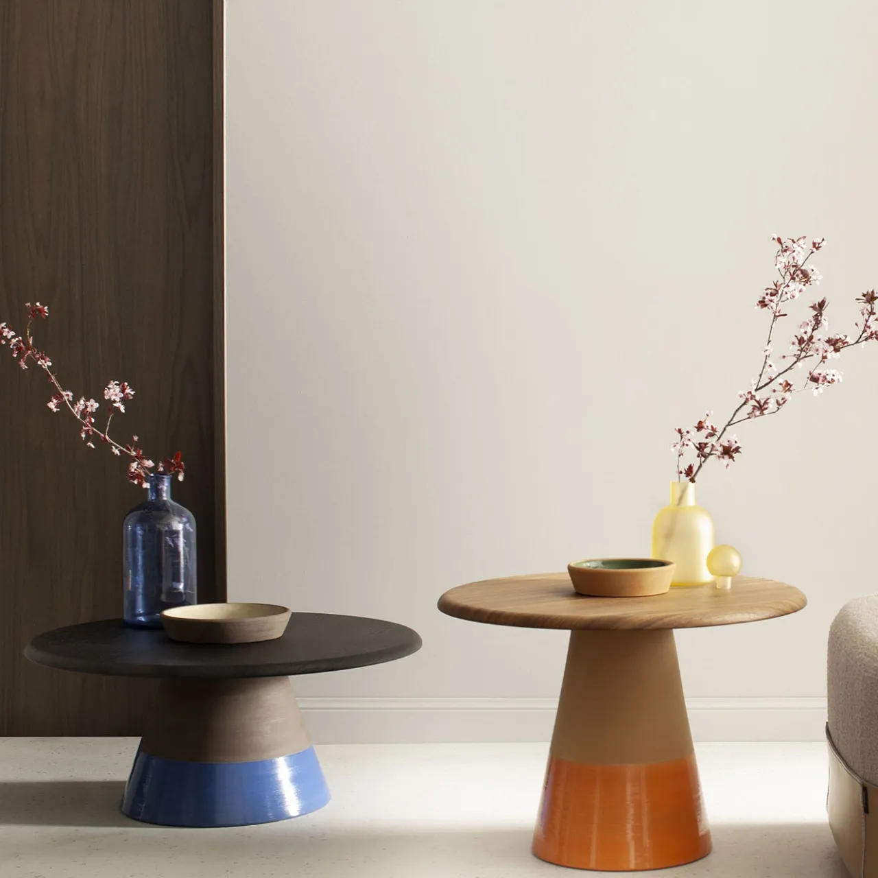 Un’ode all’artigianato, questo tavolino presenta una base in terracotta naturale scura, sapientemente tornita al tornio, ornata da un inserto in smalto azzurro lucido. Il piano del tavolo, realizzato in MDF impiallacciato in rovere Laguna con finitura stampata a membrana, si armonizza perfettamente con la base in terra. Un vano portaoggetti in terracotta, smaltato internamente in tortora lucido, aggiunge un’eleganza pratica a questo pezzo, rendendolo un’aggiunta accattivante a qualsiasi ambiente del soggiorno.