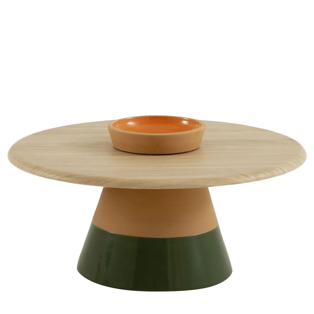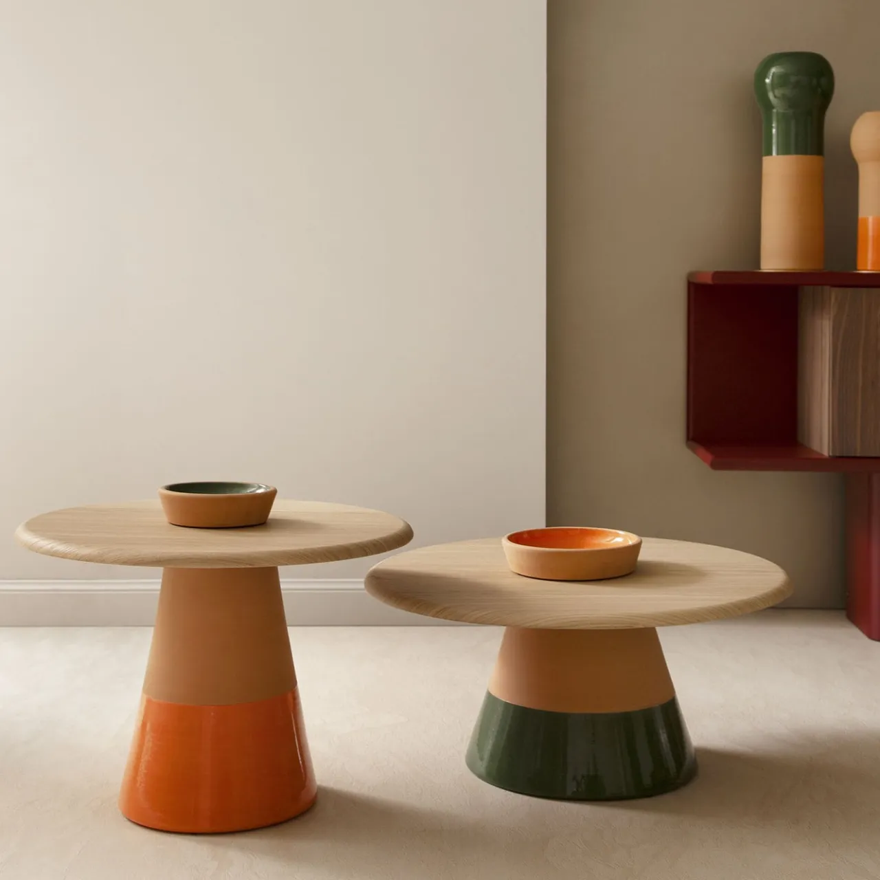 Testimonianza di finezza artigianale, questo tavolino presenta una base in terracotta naturale, sapientemente lavorata e impreziosita da un inserto in smalto arancione mandarino lucido. Il piano del tavolo, realizzato in MDF impiallacciato in rovere naturale con finitura pressata a membrana, completa le tonalità della terra. Completato da un vano portaoggetti in terracotta, smaltato internamente in verde muschio lucido, questo tavolo armonizza la praticità con l’allure artistica, rendendolo un centrotavola accattivante per qualsiasi spazio abitativo.