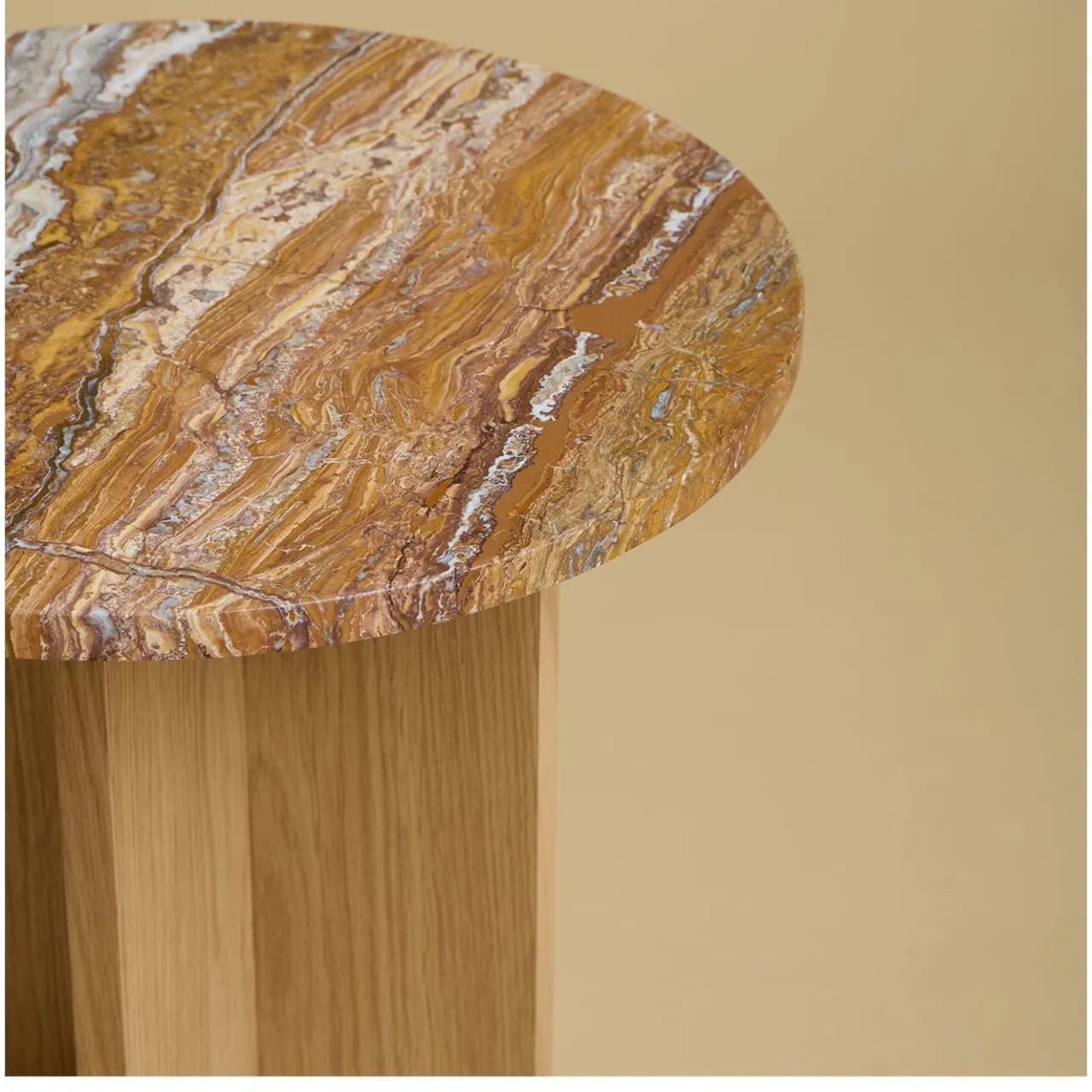 Perfetto connubio tra arte e raffinatezza, il tavolino Sherman combina uno squisito piano in travertino arancione con una base in legno di rovere, sapientemente assemblata incollando assi perpendicolari. Rifinito a mano per esaltare il fascino naturale del marmo e del legno, è disponibile in altre versioni sul catalogo Artemest.