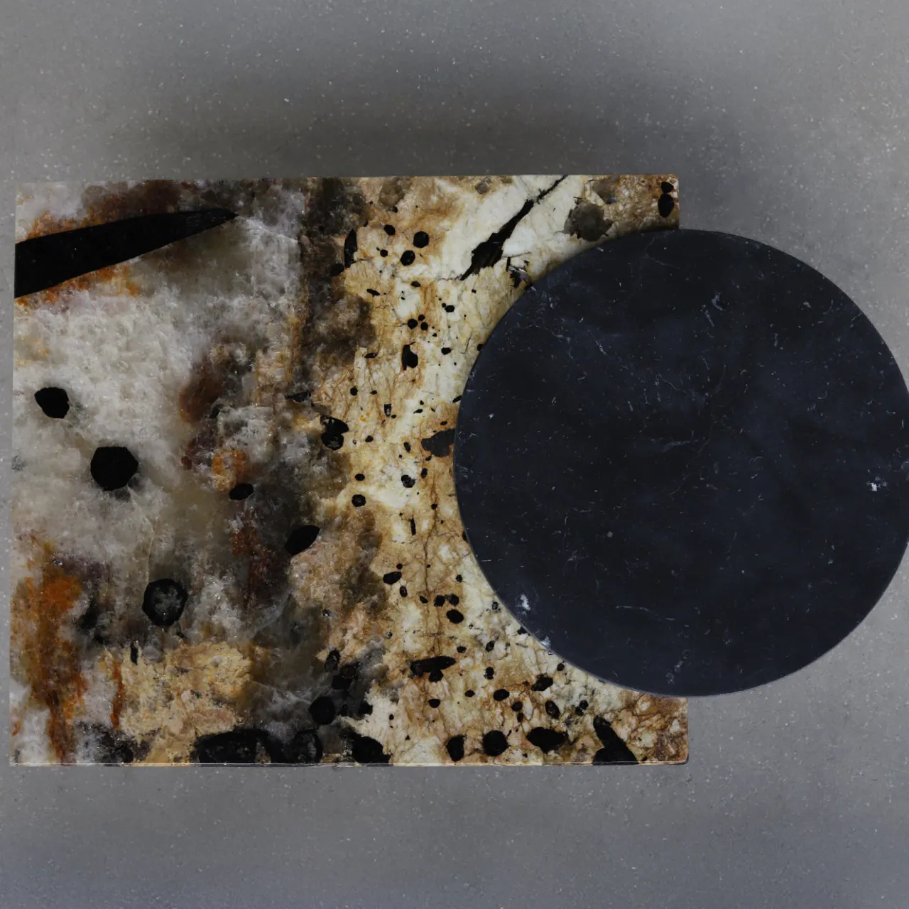 Questo tavolino da caffè è uno studio di contrasti geometrici, in cui una base quadrata incontra un piano circolare sovrapposto. L’accostamento di queste due forme essenziali crea una composizione dinamica, amplificando la tensione visiva tra struttura e fluidità. La base in blocco di marmo Marquina sostiene un piano rettangolare in Patagonia, mentre l’elemento circolare superiore, anch’esso in Marquina, presenta una raffinata finitura opaca. Un tocco di eleganza e raffinatezza che impreziosisce qualsiasi spazio abitativo.