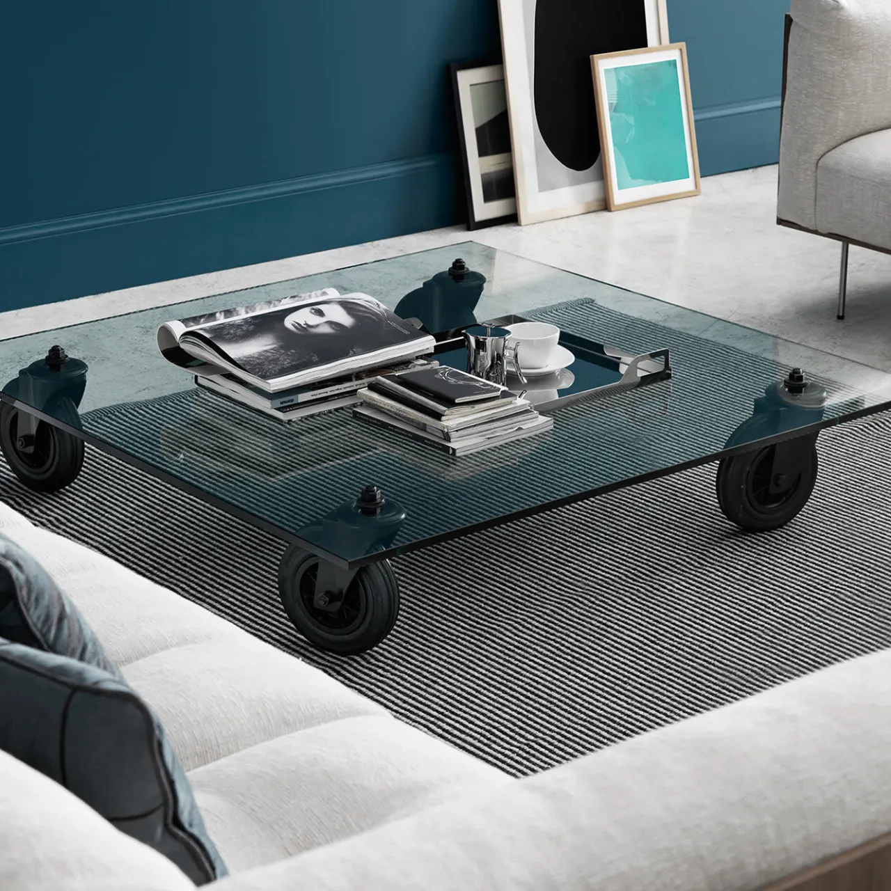 Quando era direttore artistico di FontanaArte, Gae Aulenti si è ispirata al carrello industriale utilizzato per trasportare i pannelli di vetro nei laboratori. Il design anticonvenzionale di questo tavolino è nato dalla combinazione di un piano in vetro spesso 15 mm, sostenuto da quattro ruote corte, e di una struttura in metallo rifinita in nero. È disponibile in sette diverse dimensioni che combinano piani quadrati e rettangolari. Per le opzioni, consultare il Concierge.