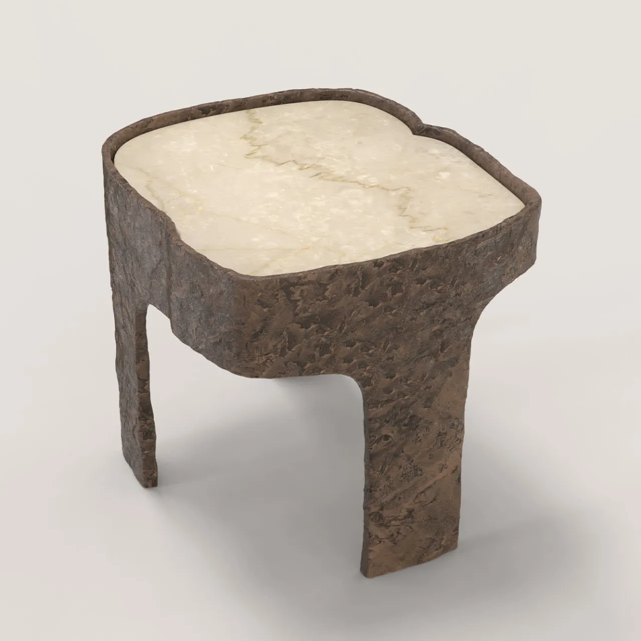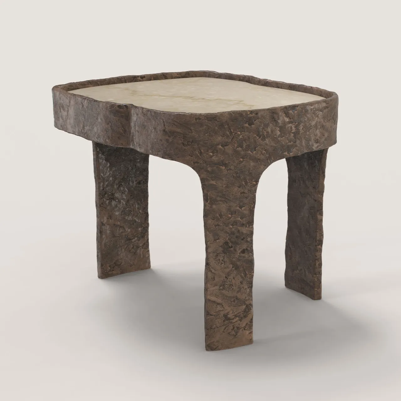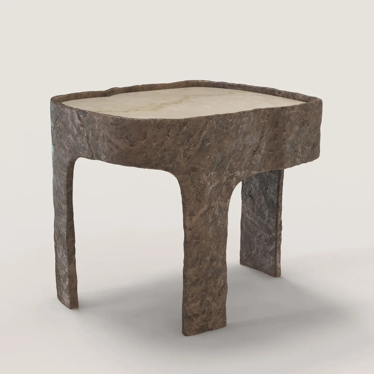 Sumatra V1 è un tavolino del XXI secolo realizzato da artigiani italiani in bronzo fuso con patina marrone chiaro con uno straordinario piano in marmo Botticino Classico. Fa parte del linguaggio del design da collezione Sumatra, sviluppato dal team di ricerca artistica di Edizione Limitata a Milano. L’oggetto fonda la sua eleganza nel contrasto tra la levigatezza della pietra e la texture materica del corpo in alluminio. Edizione limitata di 15 + 3 AP.